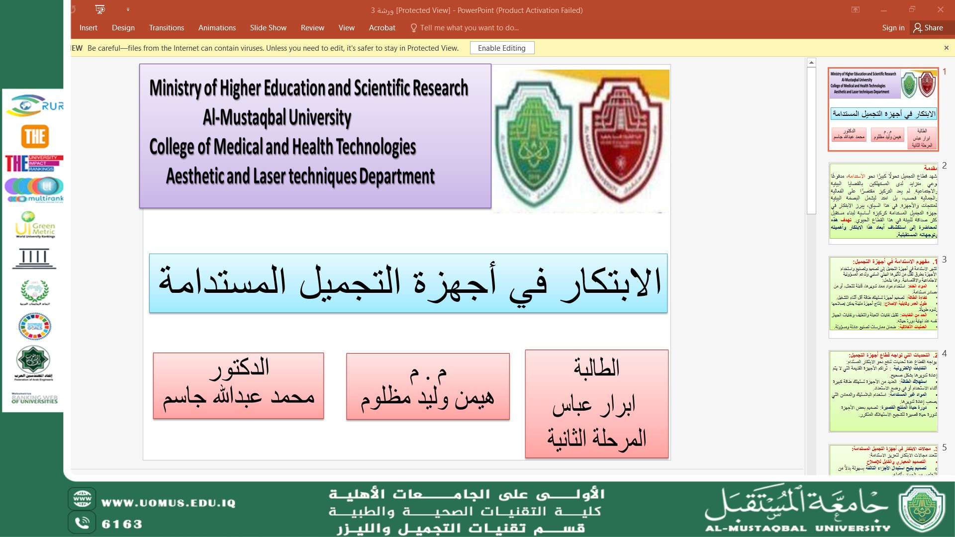 برعاية الأستاذ الدكتور حسن شاكر مجدي، رئيس جامعة المستقبل، وبإشراف الأستاذ الدكتور مظفر صادق الزهيري...