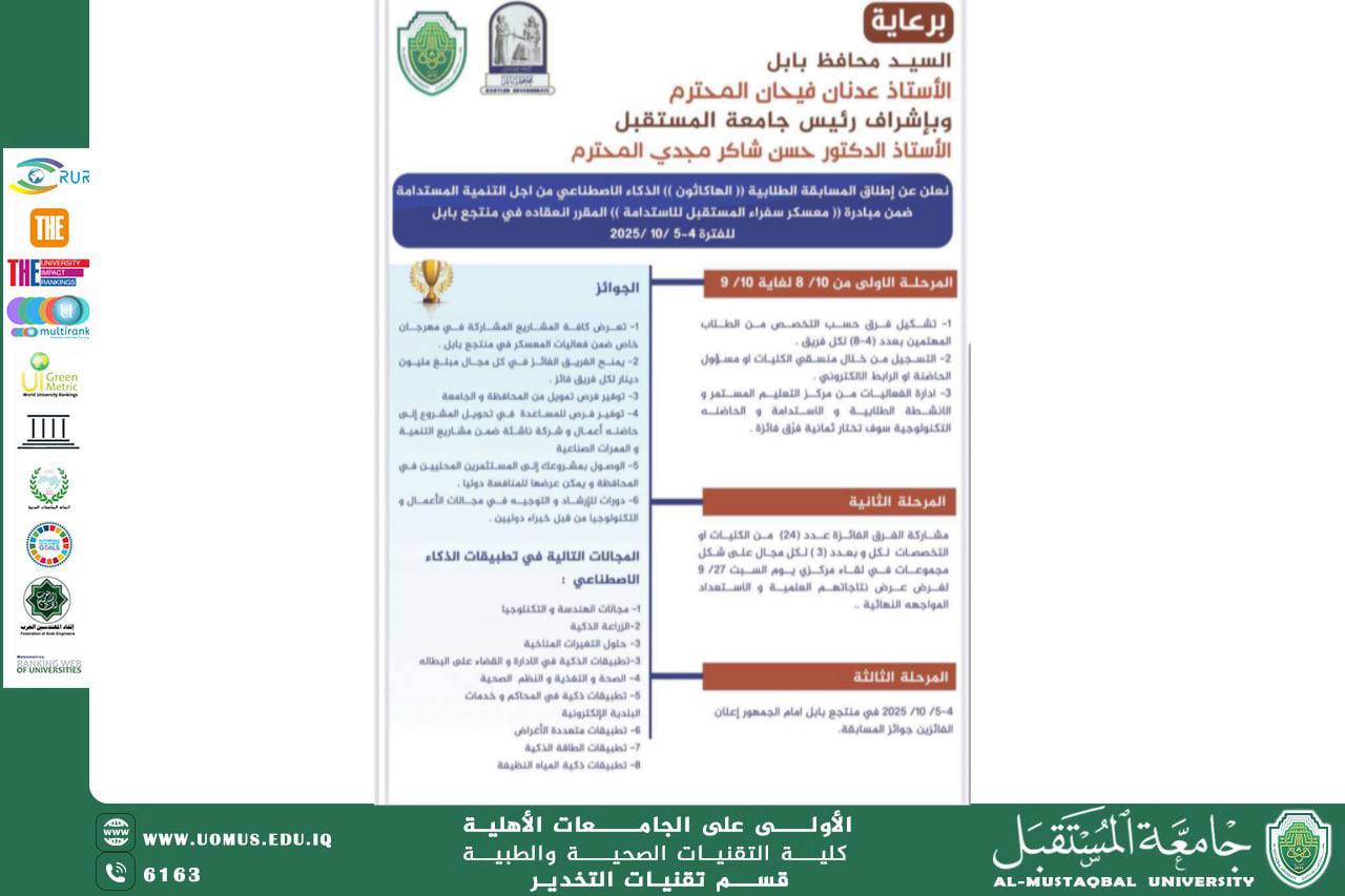 The Department of Anesthesia Technology at Al-Mustaqbal University announces its participation in the activities of Al-Mustaqbal Ambassadors for Sustainability Camp, held under the patronage of the Governor of Babil and supervised by Babil University and Al-Mustaqbal University, at the Babil Tourist Resort from October 4 - 5, 2025