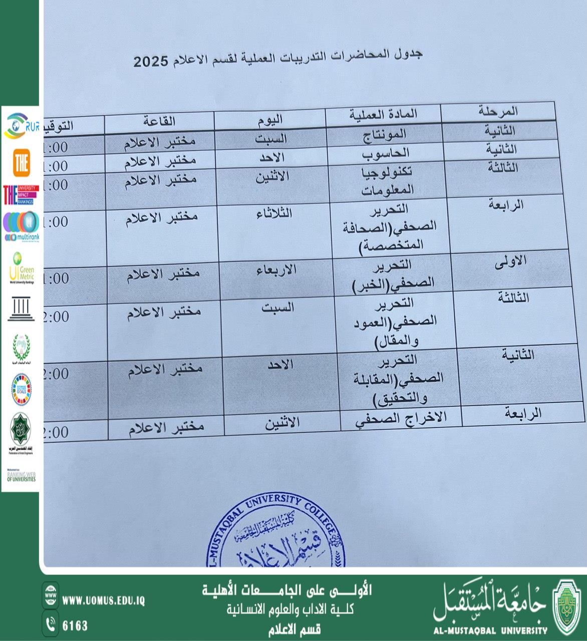 جدول المحاضرات التدريبية العلمية لقسم الإعلام 2025