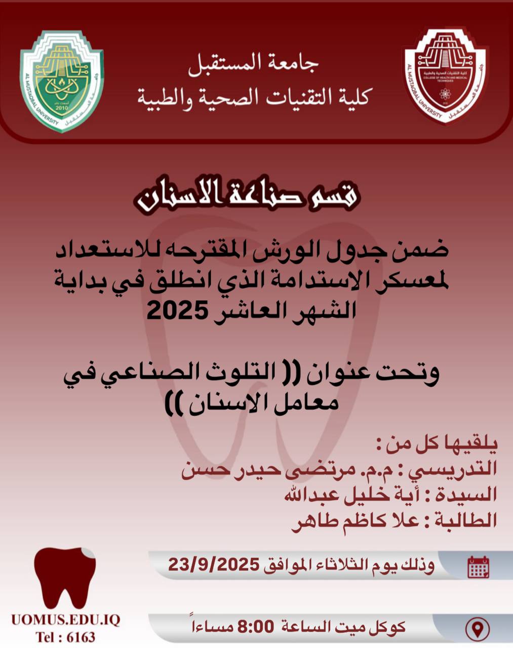 السلام عليكم ورحمة الله وبركاته… ضمن جدول الورش المقترحه للاستعداد لمعسكر الاستدامة الذي انطلق في بداية الشهر العاشر 2025 سيقيم قسم تقنيات صناعة الاسنان ورشة الكترونيه اليوم الثلاثاء الموافق 23/9/2025في تمام الساعة 8:00 مساءاً وتحت عنوان (( التلوث الصناعي في معامل الاسنان )) يلقيها كل من : التدريسي م.م. مرتضى حيدر حسن السيدة ايه خليل عبدالله الطالبة علا كاظم طاهر رابط الورشة ادناه على كوكل ميت