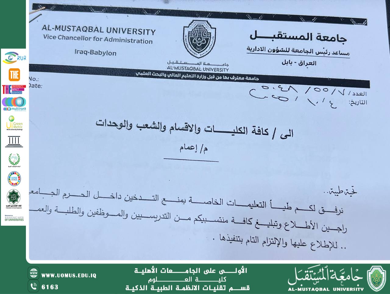 تدعو جامعة المستقبل كافة الكليات والأقسام والشعب والوحدات بمنع التدخين داخل الحرم الجامعي، وذلك استنادًا إلى توجيهات السيد مساعد رئيس الجامعة للشؤون الإدارية. يُرجى من جميع الطلبة والمنتسبين الالتزام بالتعليمات لمحافظة على المظهر اللائق الذي يعكس هوية الجامعة ورصانتها الأكاديمية. 🔸 ملاحظة: غرامة مالية بما لايقل عن 25 دينار اذا كان المخالف عضو هيئة تدريسية غرامة مالية بما لا يقل عن 15 دينار اذا كان المخالف عامل. غرامة مالية بما لا يقل عن 10 دينار اذا كان المخالف طالب