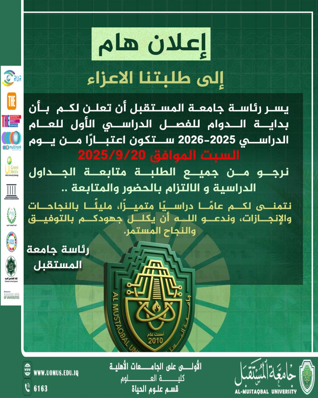 بداية العام الدراسي الجديد يوم السبت المصادف 20-9-2025