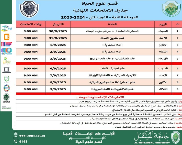 جدول الامتحانات النهائية ( الدور الثاني ) لطلبة المرحلة الثانية للعام الدراسي 2024-2025