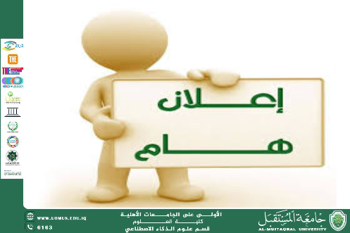على طلبة المرحلة الثانية في قسم علوم الذكاء الاصطناعي مراجعة القسم لغرض: 1️⃣ استلام هوية نظام SIS. 2️⃣ استلام الباج الجامعي الجديد للعام الدراسي (2025 – 2026). راجين من جميع الطلبة الالتزام بمراجعة القسم في أوقات الدوام الرسمي لغرض إكمال الإجراءات الأصولية