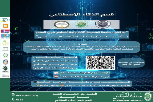 � دعوة للمشاركة في مسابقة الهاكاثون لطلبة علوم الذكاء الاصطناعي يدعو قسم علوم الذكاء الاصطناعي جميع طلبته الأعزاء إلى الإسراع بالمشاركة في مسابقة الهاكاثون من خلال ملء الاستمارة عبر الباركود المرفق أدناه. حيث سيتم إعداد إحصائية بأعداد الطلبة المسجلين بشكل رسمي، وعليه نؤكد ضرورة تسجيل الجميع في أسرع وقت ممكن. 🔹 المشاركة في المسابقة تمثل فرصة حقيقية لتنمية مهاراتكم العملية والعلمية، وإبراز قدراتكم الإبداعية في مجال الذكاء الاصطناعي. 🔹 علماً أن عدم التسجيل سيُعتبر عزوفاً عن المشاركة. مع تمنياتنا لجميع طلبتنا بدوام الموفقية والنجاح �