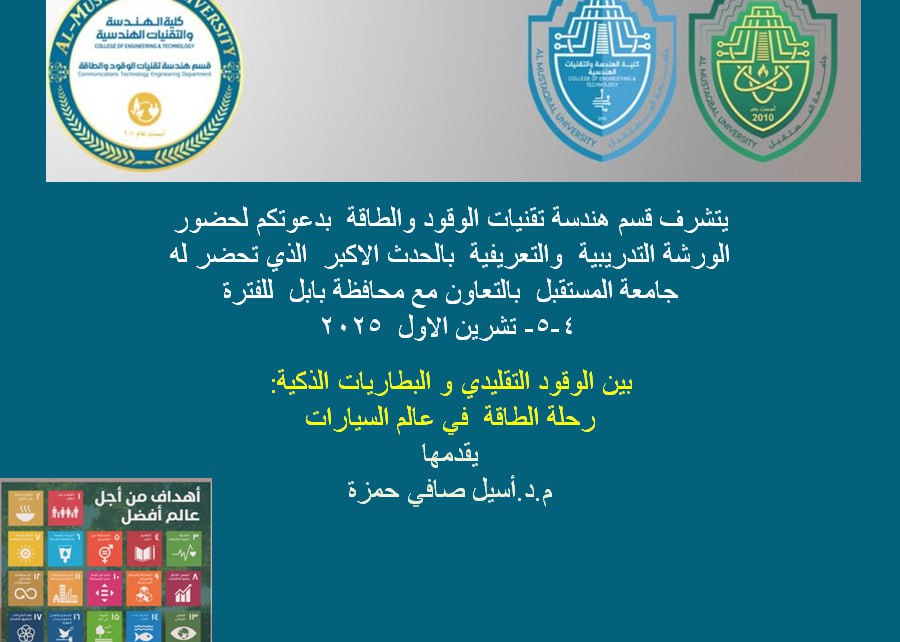 📢 دعوة لحضور ورشة تدريبية تعريفية يتشرف قسم هندسة تقنيات الوقود والطاقة بدعوتكم لحضور الورشة التدريبية والتعريفية ضمن الحدث الأكبر الذي تحضّر له جامعة المستقبل بالتعاون مع محافظة بابل، وذلك للفترة من 4 – 5 تشرين الأول 2025. 🔋 عنوان الورشة: بين الوقود التقليدي والبطاريات الذكية: رحلة الطاقة في عالم السيارات 🎙️ تقدّمها: م.د. أسيل صافي حمزة 🌍 نحو تحقيق أهداف من أجل عالم أفضل