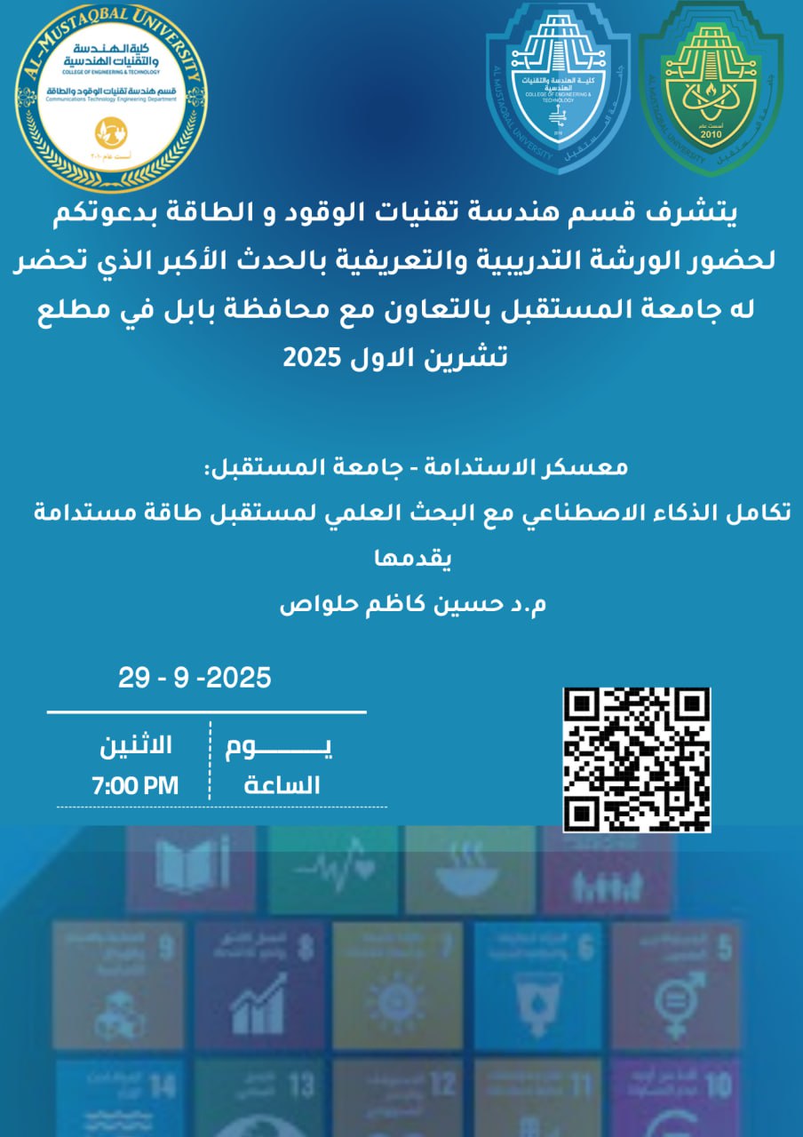📢 دعوة لحضور ورشة تدريبية تعريفية مميزة! يتشرف قسم هندسة تقنيات الوقود والطاقة بدعوتكم لحضور الورشة التدريبية والتعريفية الكبرى ضمن معسكر الاستدامة – جامعة المستقبل بالتعاون مع محافظة بابل، بعنوان: "تكامل الذكاء الاصطناعي مع البحث العلمي لمستقبل طاقة مستدامة" يقدمها: م.د حسين كاظم حلوص 🗓️ الاثنين 29-9-2025 🕖 الساعة 7:00 مساءً كونوا على الموعد مع الابتكار والاستدامة! 🌍⚙️