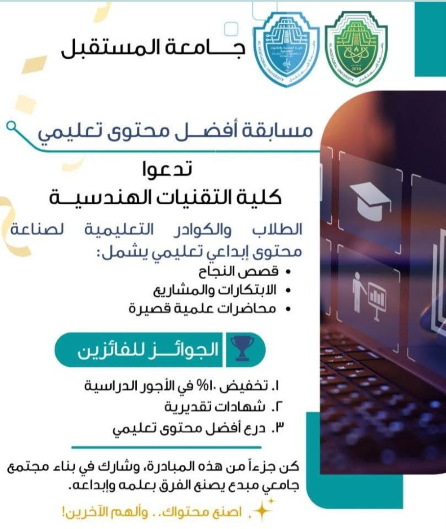 📢 مسابقة أفضل محتوى تعليمي تدعو كلية التقنيات الهندسية - جامعة المستقبل الطلاب والكادر للمشاركة بمحتوى إبداعي: قصص نجاح، ابتكارات، ومحاضرات قصيرة. 🏆 جوائز للفائزين: خصم 50% على الرسوم، شهادات، ودروع. ✨ شارك واصنع الفرق!
