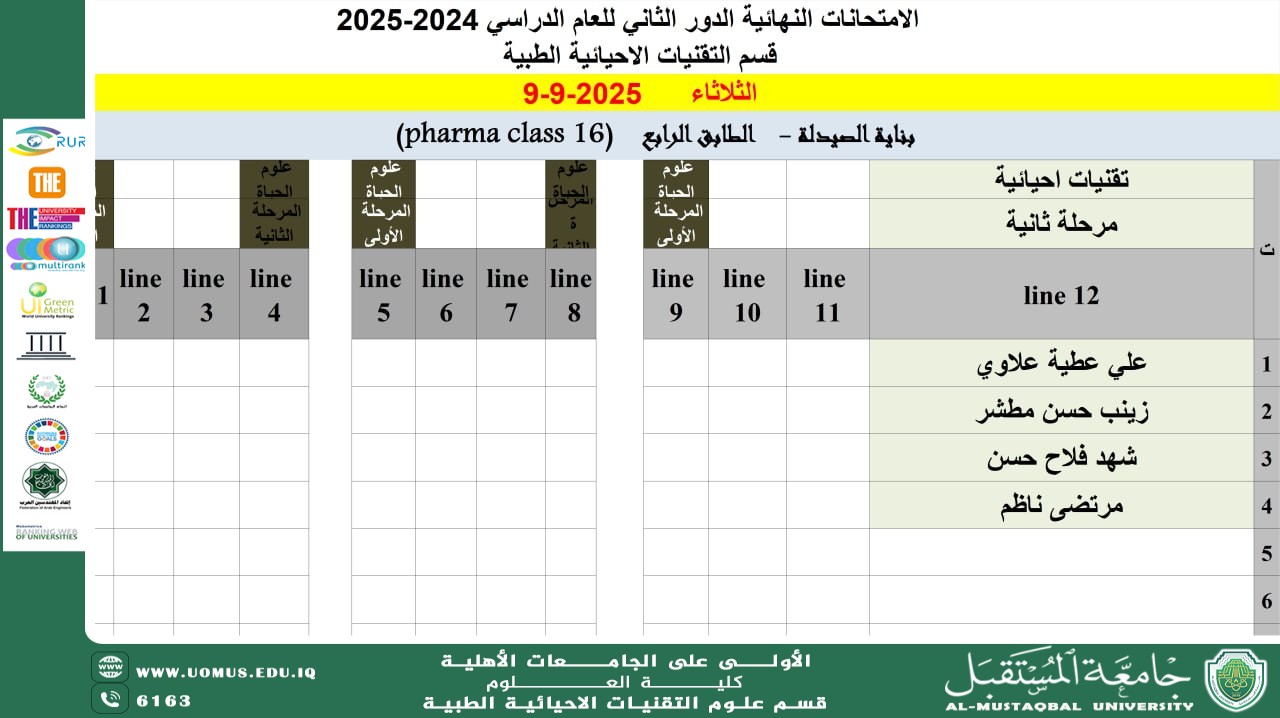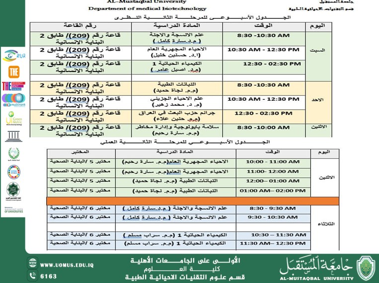 جدول الاسبوعي لطلبة المرحلة الثانية قسم التقنيات الاحيائية الطبية .