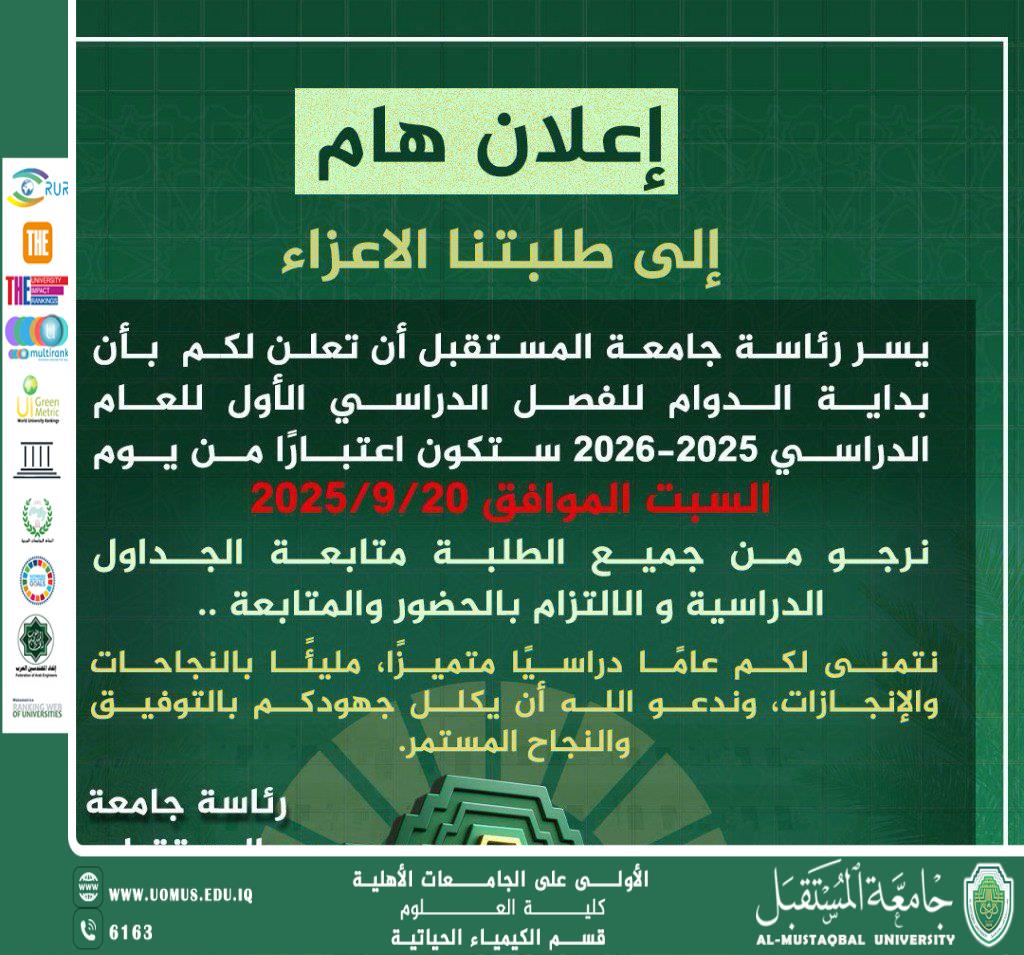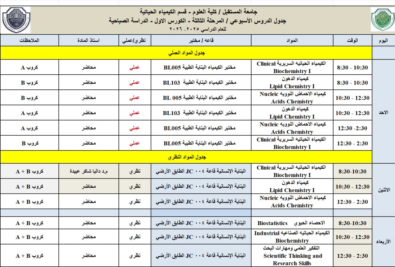 يُعلن قسم الكيمياء الحياتية عن جدول الدروس الأسبوعية للمرحلة الثالثة للعام الدراسي 2025–2026، ويُرجى من الطلبة الالتزام بالحضور في المواعيد المحددة.
