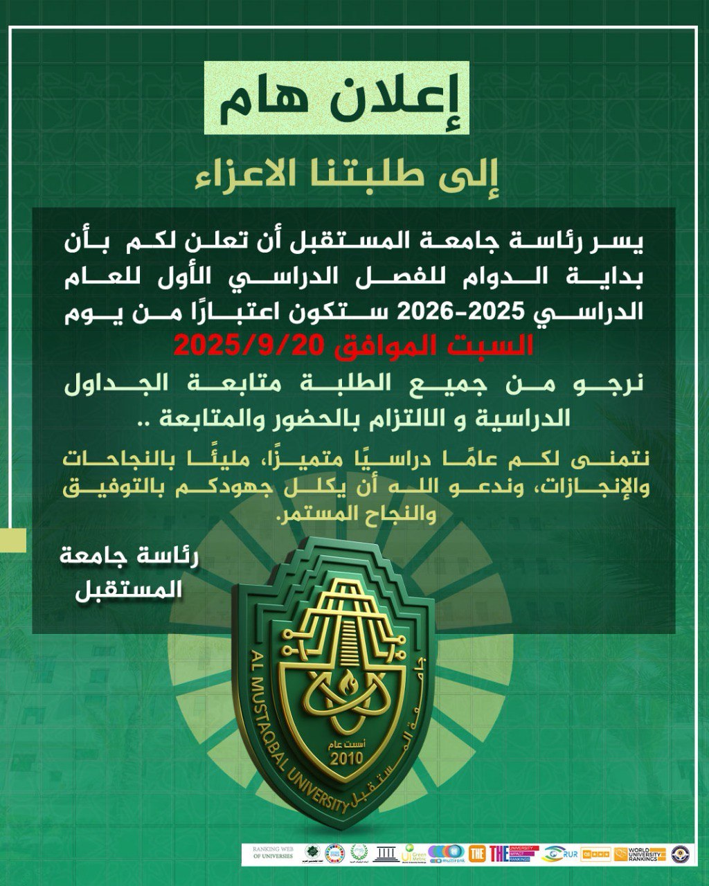 إستمرار التقديم لبرامج الماجستير المستضافة في جامعة المستقبل للعام الدراسي ٢٠٢٥ / ٢٠٢٦.