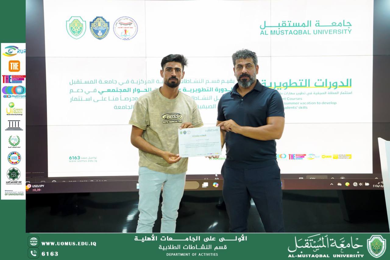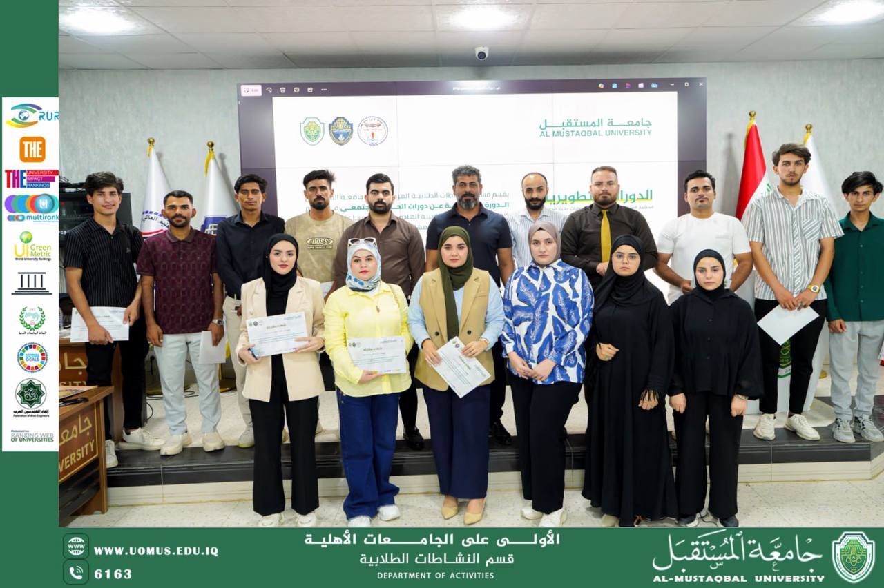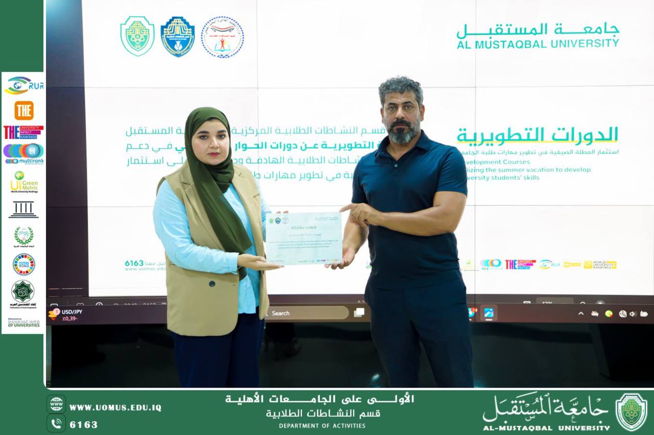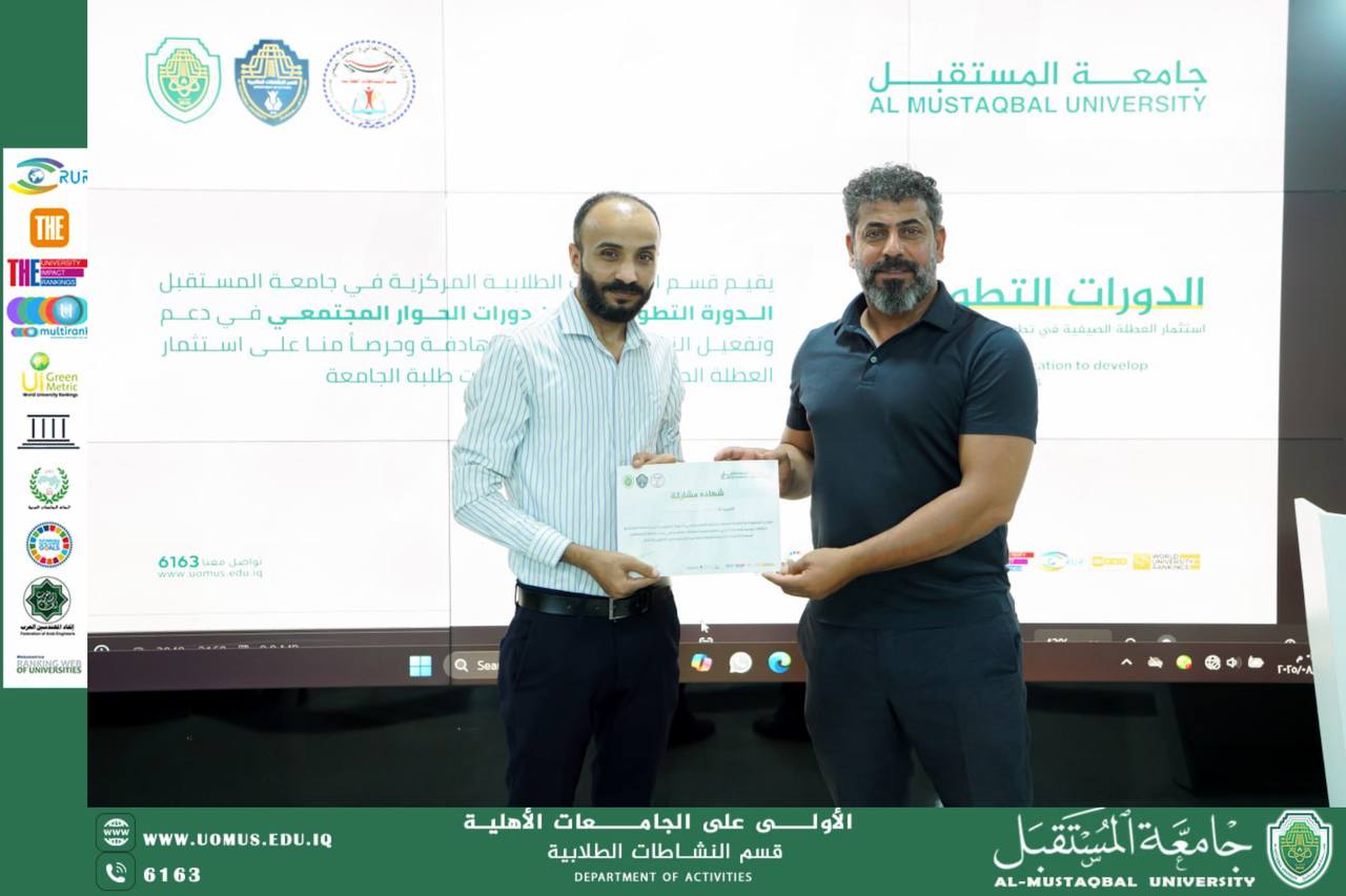 في إطار حرص جامعة المستقبل على تنمية مهارات طلبتها وتعزيز قيم التفاهم والتواصل البنّاء، أُقيمت دورة تدريبية بعنوان الحوار المجتمعي، والتي هدفت إلى ترسيخ ثقافة الحوار الإيجابي بين الطلبة وإكسابهم مهارات الإصغاء والتواصل الفعّال،تضمنت الدورة محاضرات نظرية تناولت مفهوم الحوار المجتمعي وأهميته في بناء العلاقات الإنسانية السليمة وتعزيز روح التعاون بين مختلف فئات المجتمع، إضافة إلى أنشطة عملية هدفت إلى تدريب المشاركين على تقنيات إدارة النقاشات وتقبل الرأي الآخر بروح منفتحة. كما شارك الطلبة في تطبيقات جماعية تحاكي مواقف حياتية تحتاج إلى الحوار لحل الخلافات والوصول إلى حلول وسطية، وخرجت الدورة بعدة نتائج مهمة، من أبرزها رفع مستوى وعي الطلبة بأهمية الحوار كوسيلة لحل النزاعات وتعزيز التفاهم المتبادل، تنمية مهارات الإصغاء الفعّال واحترام آراء الآخرين، إضافة إلى تمكين المشاركين من تطبيق أساليب الحوار البناء في حياتهم الجامعية والاجتماعية.