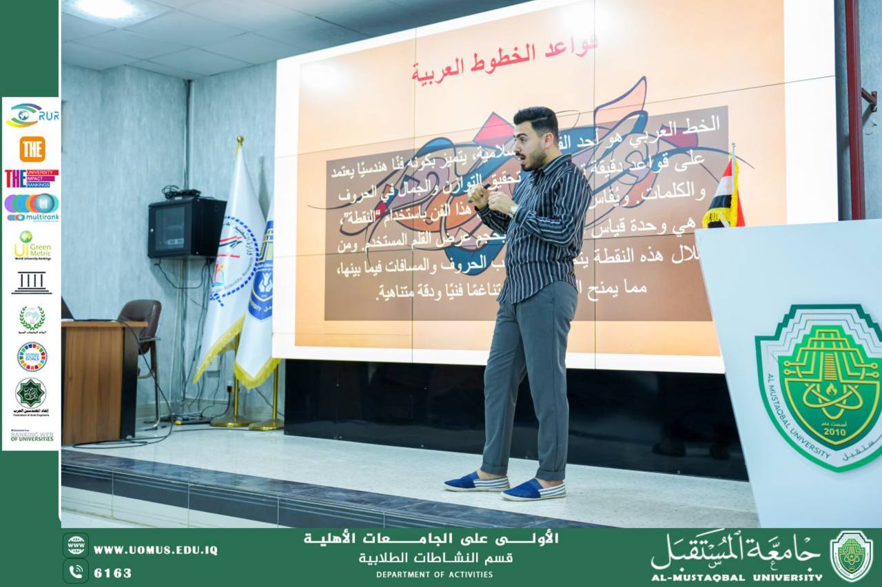 ضمن محور الأنشطة الفنية التي تنظمها جامعة المستقبل، أُقيمت دورة تدريبية بعنوان الخط العربي، استهدفت الطلبة المهتمين بتنمية مهاراتهم في فنون الكتابة العربية وصقل قدراتهم الإبداعية في هذا المجال التراثي الأصيل، تضمنت الدورة محاضرات نظرية حول تاريخ الخط العربي وأنواعه وقيمته الفنية والثقافية، بالإضافة إلى تدريبات عملية على أساسيات كتابة الحروف والكلمات باستخدام أقلام الخط وأدواته المختلفة. كما أُتيح للمشاركين تنفيذ نماذج تطبيقية عملية في الخطوط الأكثر شيوعًا مثل الخط الكوفي والنسخ والرقعة،وقد خرجت الدورة بعدة نتائج مهمة، كان أبرزها تمكين الطلبة من التعرف على أسس وقواعد الخط العربي، وتحسين مهاراتهم الكتابية بشكل فني وجمالي، فضلًا عن تعزيز ارتباطهم بالهوية الثقافية والحضارية العربية من خلال هذا الفن العريق.