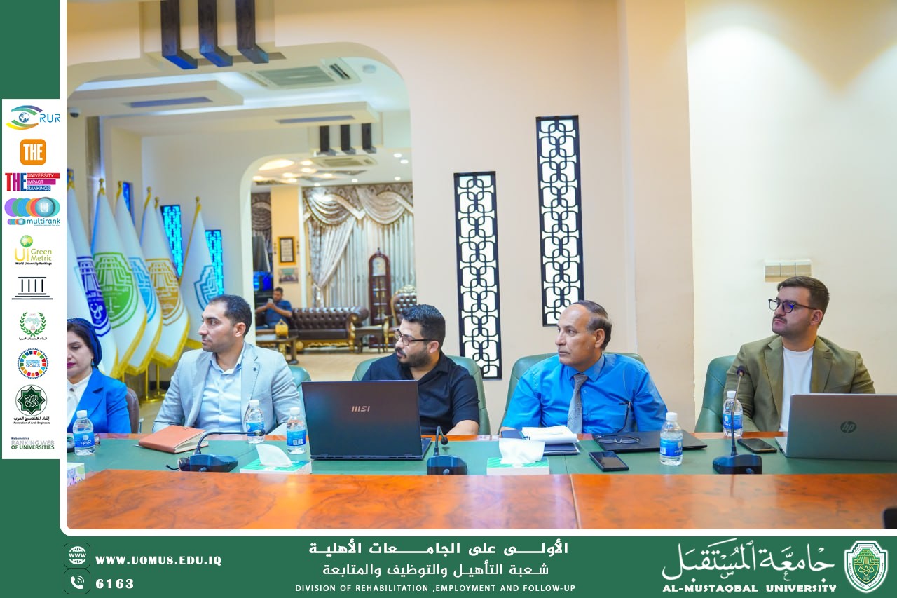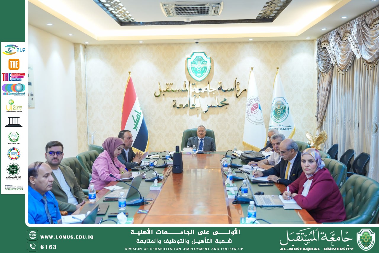 بصفته جزءاً من متابعته المستمرة لمختلف أنشطة الجامعة، ترأس رئيس جامعة المستقبل، الأستاذ الدكتور حسن شاكر مجدي، اجتماعاً موسعاً لمراجعة وتقييم أداء الأقسام العلمية في رئاسة الجامعة. وحضر الاجتماع مدير الإشراف العلمي والأكاديمي الأستاذ الدكتور مظفر صادق الزهيري، والمستشار التربوي الأستاذ الدكتور محسن عبد علي، إضافة إلى مديري المراكز البحثية والأقسام والشعب العلمية، فضلاً عن عدد من الموظفين المعنيين.