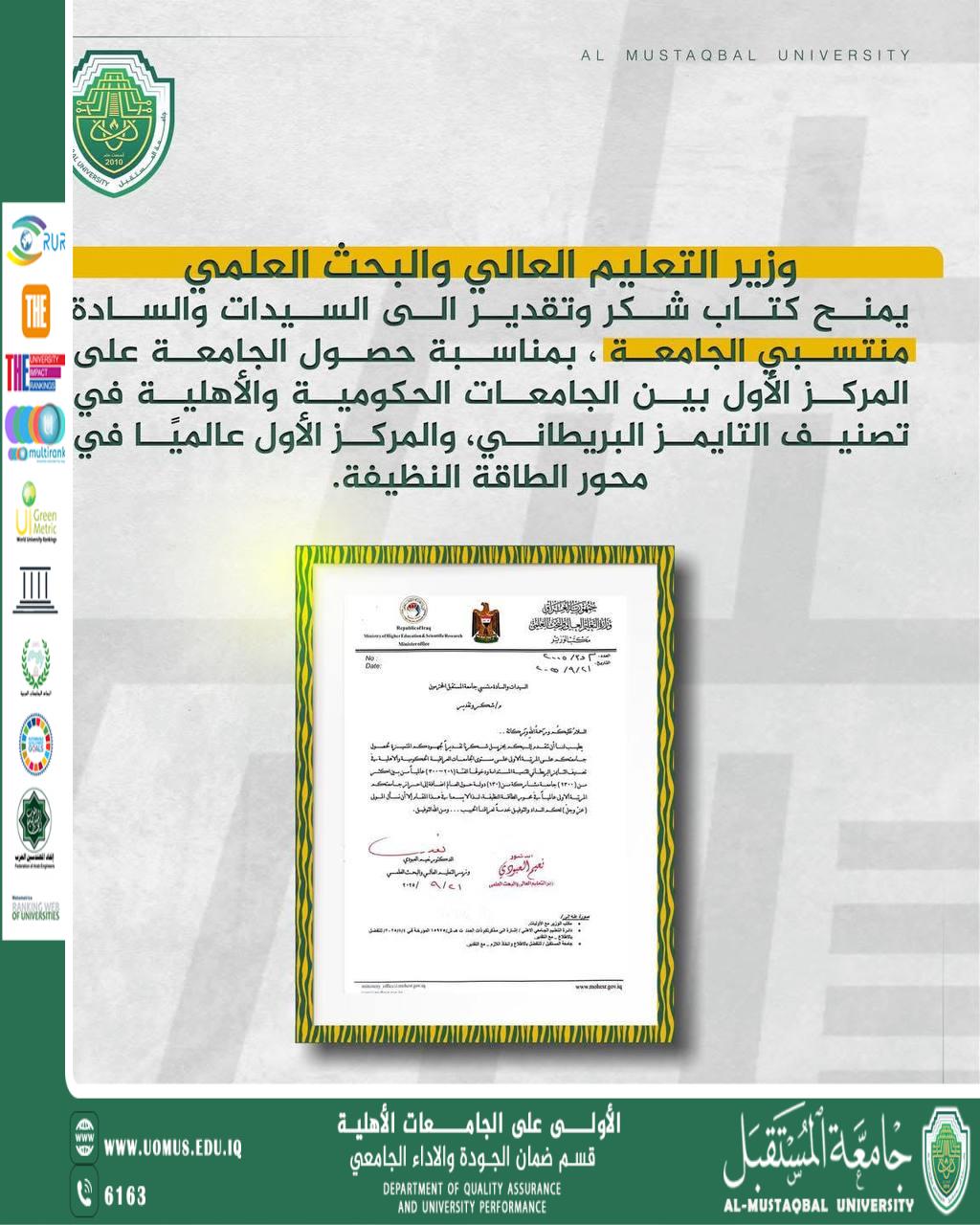 معالي وزير التعليم العالي والبحث العلمي يوجه كتاب شكر وتقدير إلى السيد رئيس جامعة المستقبل