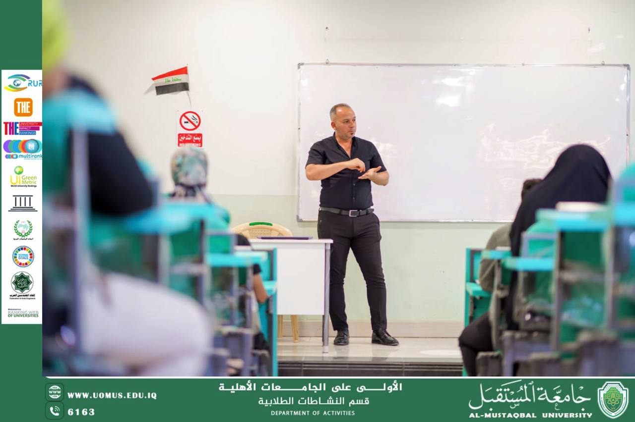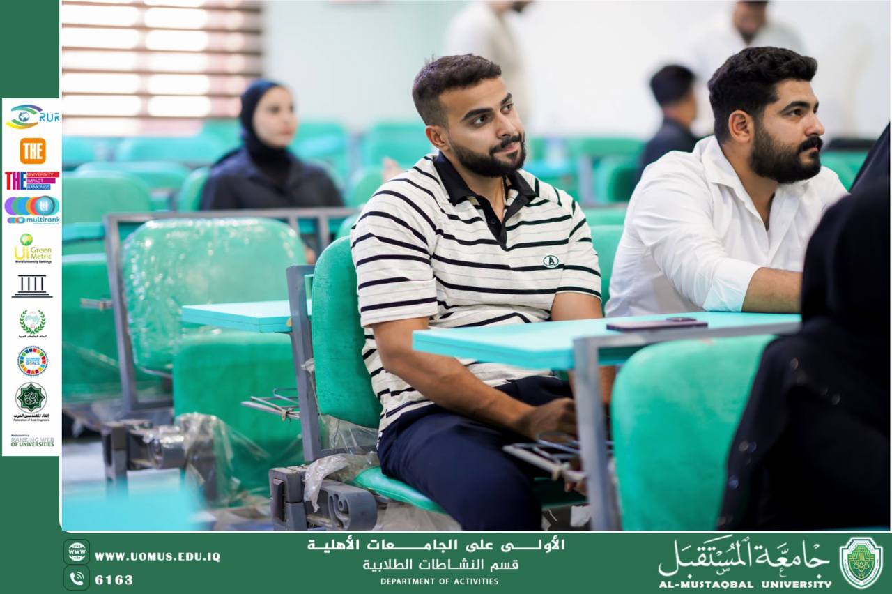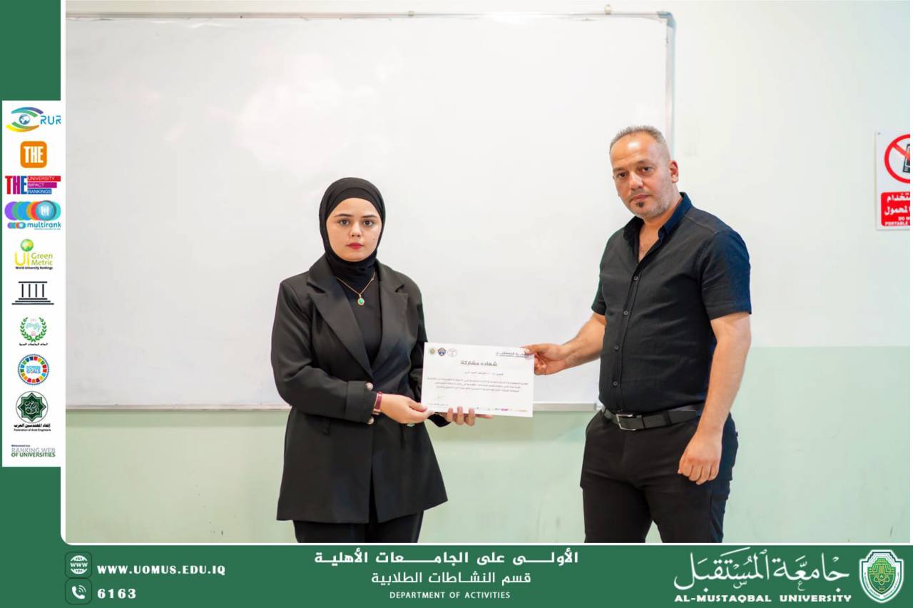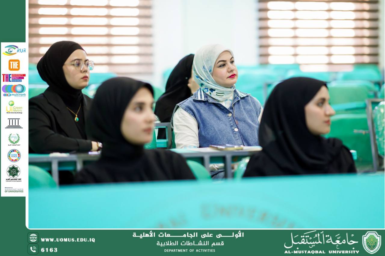 ضمن محور الأنشطة الثقافية التي تنظمها جامعة المستقبل، أُقيمت دورة تدريبية بعنوان الكتابة الإبداعية، استهدفت طلبة الجامعة الراغبين في تنمية مواهبهم الأدبية وصقل قدراتهم التعبيرية، هدفت الدورة إلى تعريف المشاركين بأسس الكتابة الأدبية الحديثة، وتشجيعهم على ابتكار نصوص تحمل بصمتهم الخاصة بعيدًا عن التقليد والرتابة،تضمنت الدورة محاضرات نظرية تناولت مفهوم الكتابة الإبداعية وأنواعها وأهم عناصرها، بالإضافة إلى تدريبات عملية في كتابة القصة القصيرة والنصوص الأدبية القصيرة، كما أُتيح للمشاركين تقديم محاولاتهم الإبداعية ومناقشتها ضمن مجموعات، مما ساهم في تبادل الخبرات وتعزيز روح النقد البنّاء، وخرجت الدورة بعدة نتائج مهمة، من أبرزها تعزيز ثقة الطلبة بقدراتهم الكتابية، وتطوير مهاراتهم في صياغة الأفكار بأسلوب أدبي مميز، فضلًا عن تحفيزهم على ممارسة الكتابة كأداة للتعبير عن الذات وتنمية الخيال والإبداع.