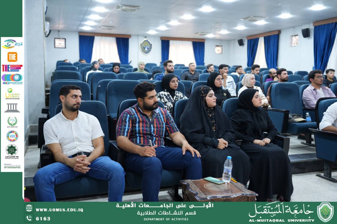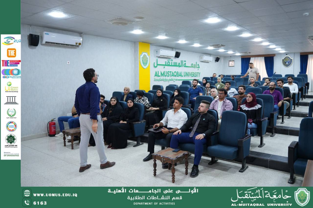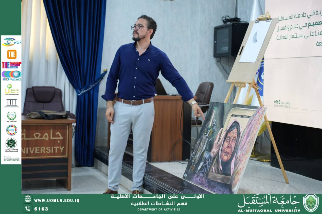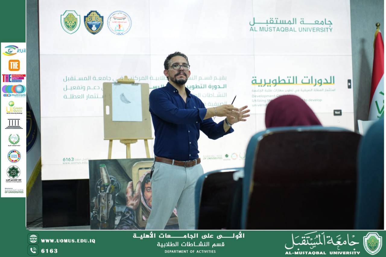 ضمن محور الأنشطة الفنية التي تنظمها جامعة المستقبل، أُقيمت دورة تدريبية بعنوان الرسم والتصميم، هدفت إلى تطوير قدرات الطلبة في مجالات الفنون البصرية وتنمية مهاراتهم الإبداعية في التعبير الفني،تضمنت الدورة محاضرات نظرية حول أسس الرسم وتقنيات التكوين الفني، بالإضافة إلى تدريبات عملية في استخدام الألوان، الظل والنور، وتطبيق مبادئ التصميم الفني في لوحات ورسومات إبداعية. كما شملت أنشطة عملية شجعّت الطلبة على إبراز مواهبهم الخاصة وإنتاج أعمال تعكس رؤيتهم الفنية،وخرجت الدورة بعدة نتائج مهمة، أبرزها تمكين المشاركين من تحسين مهاراتهم في الرسم والتصميم، وتنمية الحس الفني والجمالي لديهم، فضلًا عن تشجيعهم على استخدام الفن كوسيلة للتعبير عن الذات ونشر القيم الإنسانية والجمالية في محيطهم الجامعي والمجتمعي.