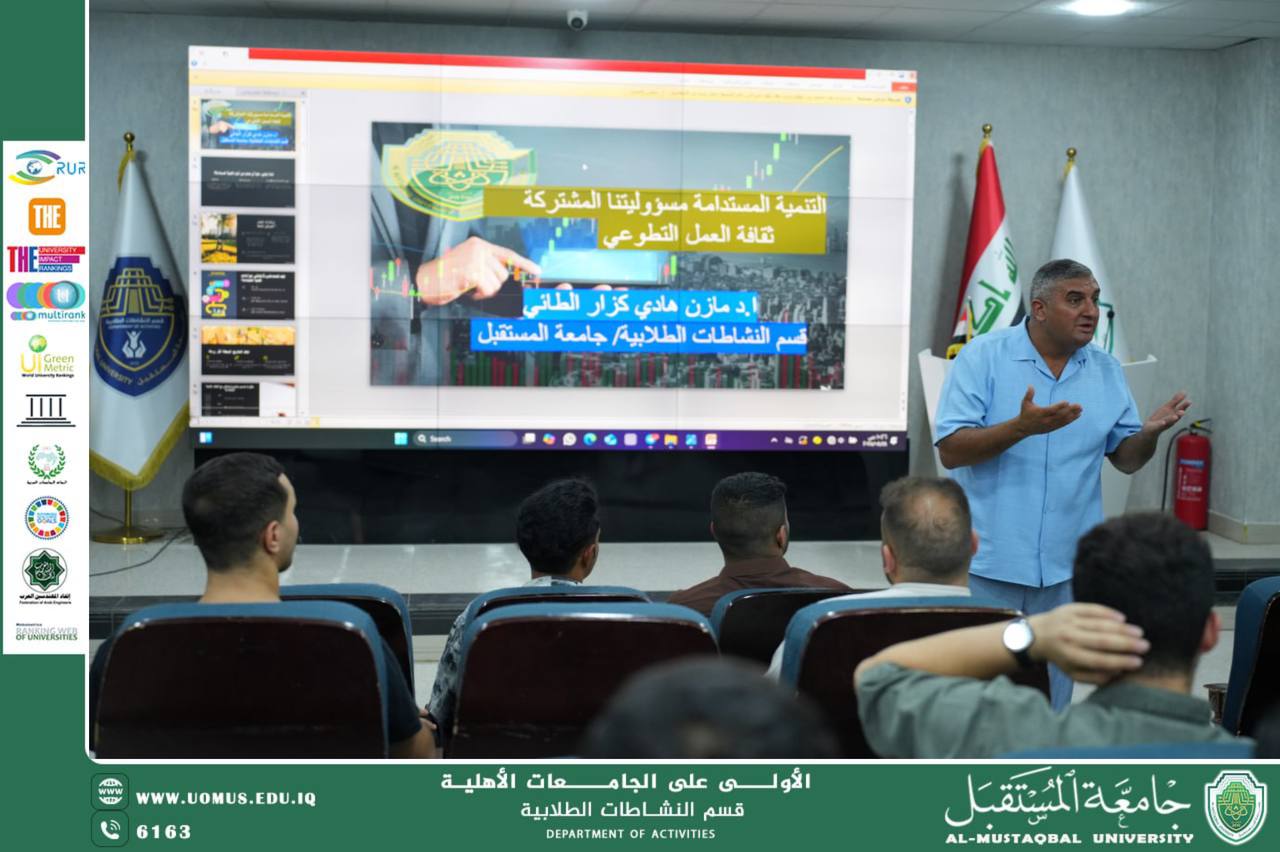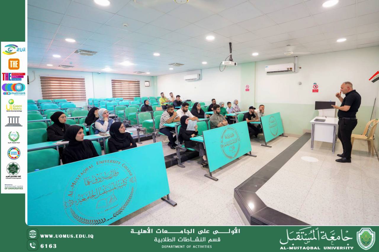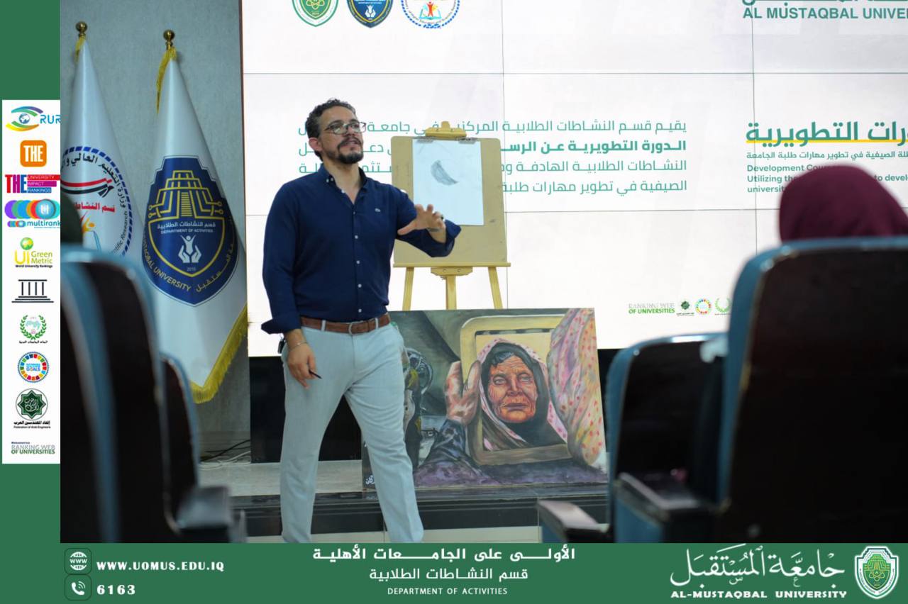 ضمن محور الأنشطة الفنية التي تنظمها جامعة المستقبل، أُقيمت دورة تدريبية بعنوان الرسم والتصميم، هدفت إلى تطوير قدرات الطلبة في مجالات الفنون البصرية وتنمية مهاراتهم الإبداعية في التعبير الفني،تضمنت الدورة محاضرات نظرية حول أسس الرسم وتقنيات التكوين الفني، بالإضافة إلى تدريبات عملية في استخدام الألوان، الظل والنور، وتطبيق مبادئ التصميم الفني في لوحات ورسومات إبداعية. كما شملت أنشطة عملية شجعّت الطلبة على إبراز مواهبهم الخاصة وإنتاج أعمال تعكس رؤيتهم الفنية،وخرجت الدورة بعدة نتائج مهمة، أبرزها تمكين المشاركين من تحسين مهاراتهم في الرسم والتصميم، وتنمية الحس الفني والجمالي لديهم، فضلًا عن تشجيعهم على استخدام الفن كوسيلة للتعبير عن الذات ونشر القيم الإنسانية والجمالية في محيطهم الجامعي والمجتمعي.