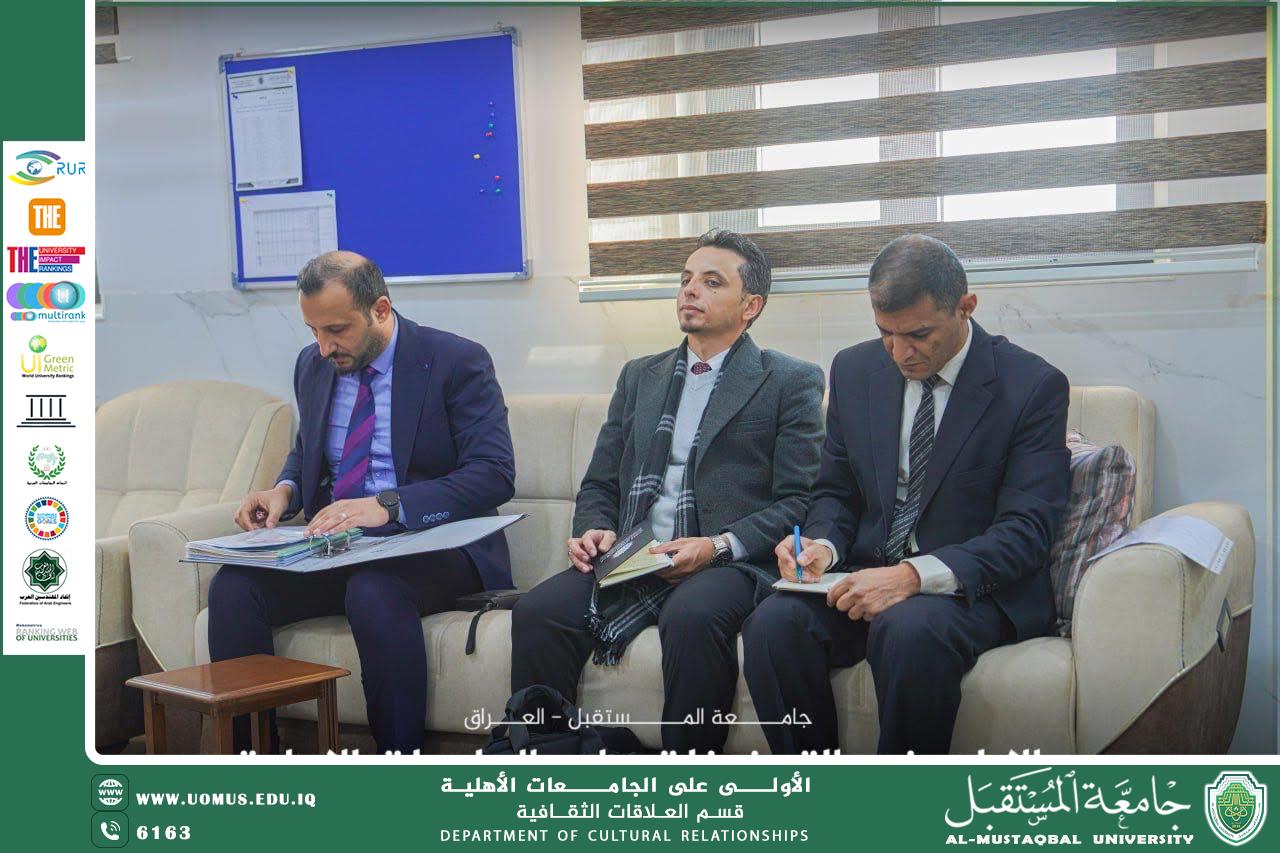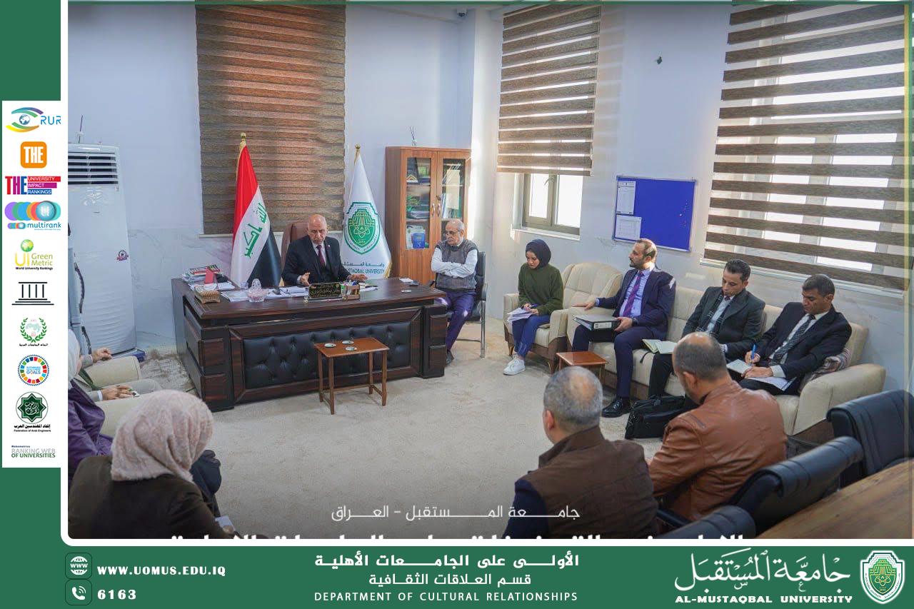 وترأس الاجتماع السيد مدير الإشراف العلمي والأكاديمي الأستاذ الدكتور مظفر صادق الزهيري، بحضور مدير قسم العلاقات الثقافية الدكتور سمير بدراوي، إلى جانب السادة أعضاء الارتباط في كليات الجامعة.