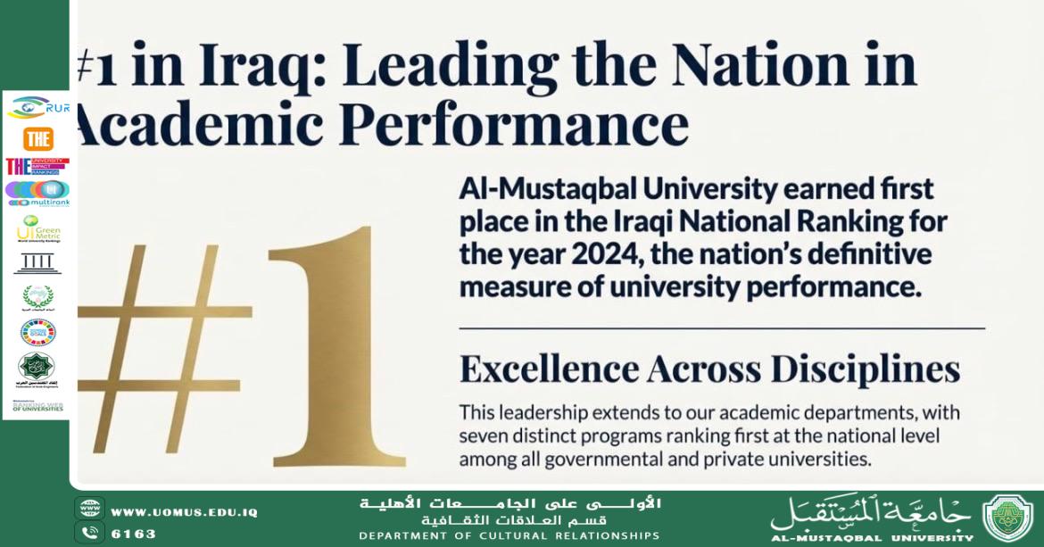 نفتخر بإنجازاتنا خلال عام 2025، والتي تعكس مكانتنا الجامعة المتميزة الاولى في العراق. بفضل جهودنا المستمرة والتزامنا بالجودة والتميز، استطعنا أن نحقق مَسارات جديدة من التقدم في التصنيفات المحلية و الدولية و جودة التعليم والبحث وخدمة المجتمع.