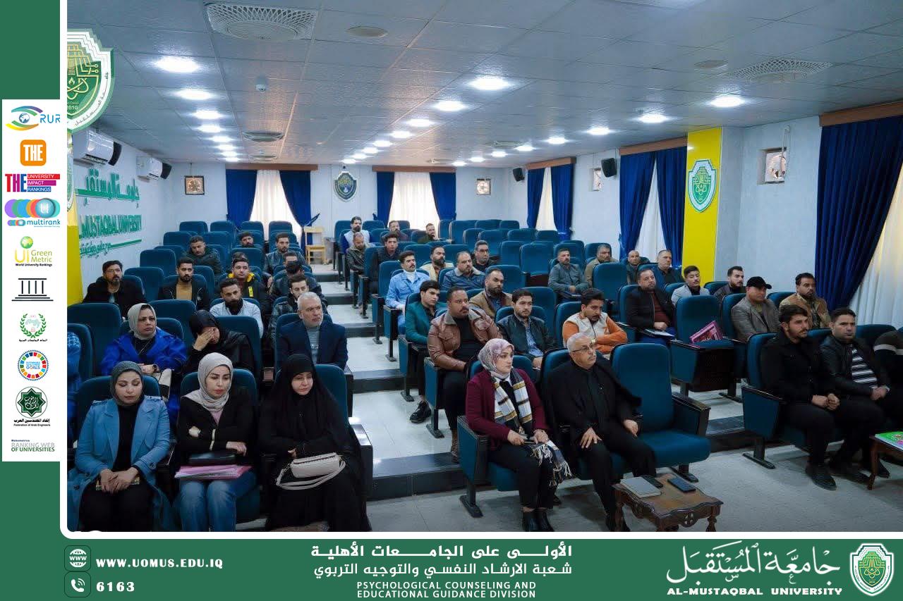 ضمن إطار الأنشطة التوعوية والتربوية، أُقامت شعبة الارشاد النفسي والتوجيه التربوي ورشة عمل بعنوان (برّ الوالدين) ،القاها كل من م.د ايمان غانم حميد من كلية الصيدلة و م.د مسلم عقيل من كلية الاداب والعلوم الانسانية وحضور السيد استشاري رئاسة الجامعة ا.د محسن عبد علي الفريجي
