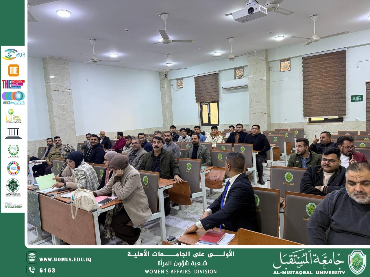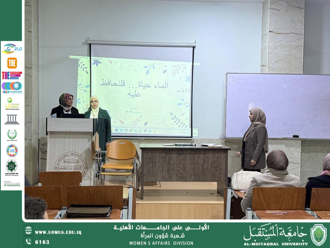 برعاية الاستاذ الدكتور حسن شاكر مجدي المحترم رئيس جامعة المستقبل. اقامت شعبة شؤون المرأة بالتعاون مع كلية التقنيات الزراعية ورشة بعنوان( الماء حياة … فلنحافظ عليه ) بأشراف م.م . ماري عمران مهدي مسؤول شعبة شؤون المرأة وتقديم م. م. سرور حافظ محمد / كلية التقنيات الزراعية يوم السبت 3/ كانون الثاني / 2026 . وان هذه الورشة تهدف الى نشر الوعي حول اهمية المياه وتوضيح الطرق البسيطة والفعالة التي نستطيع من خلالها الحفاظ على كل قطرة ، لأن كل قطرة تصنع فرقا . وحيث ان المرأة والأسرة تلعب دوراً محورياً في ترسيخ ثقافة ترشيد استهلاك المياه، كونها المسؤول المباشر عن إدارة الموارد داخل المنزل، بدءاً من تغيير عادات الاستخدام اليومية، ووصولاً إلى متابعة صيانة التسربات واستخدام التقنيات الموفرة لضمان استدامة المياه.