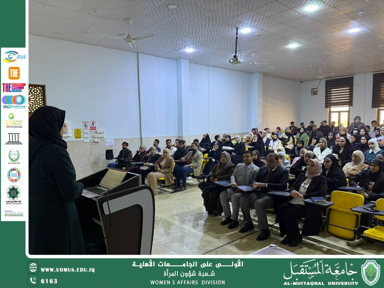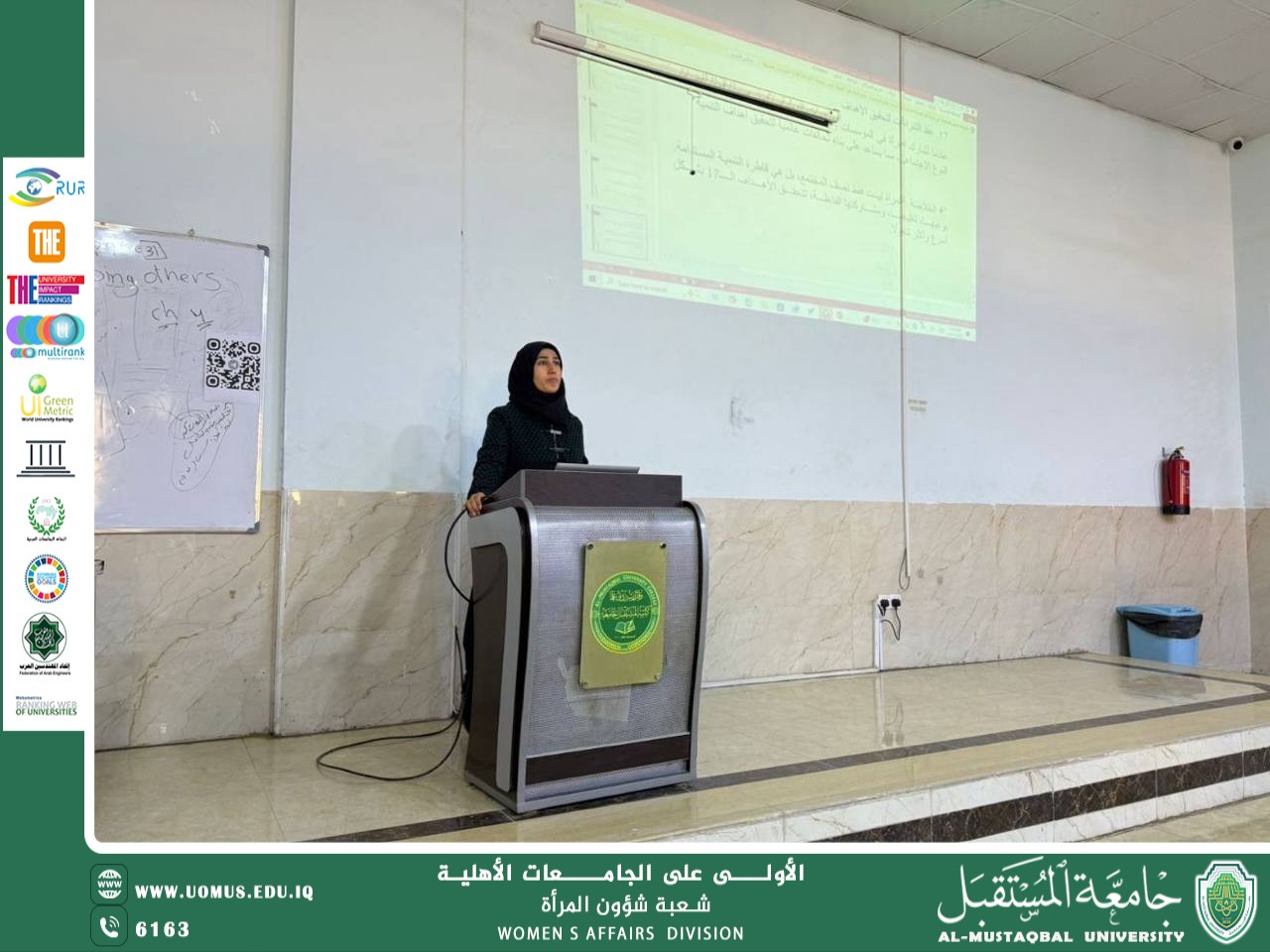 برعاية الاستاذ الدكتور حسن شاكر مجدي المحترم رئيس جامعة المستقبل قدمت وحدة المرأة في كلية التربية قسم اللغة الانكليزية بالتعاون مع شعبة شؤون المرأة ورشة توعوية بعنوان " المرأة والتعليم مفتاح التنمية المستدامة " قدمتها م.م. سجى زهير حامد عضوة وحدة شؤون المرأة في قسم اللغة الانكليزية يوم 21/ كانون الاول / 2025 وقد ركزت على الهدف الرابع من اهداف التنمية المستدامة ( التعليم الجيد ) وكذلك كانت ضمن ركيزة ( التعافي ) الفقرة ٢ من تنفيذ الاستراتيجية الوطنية لمناهضة العنف تجاه النساء والفتيات ( ٢٠٢٥- ٢٠٣٠) .