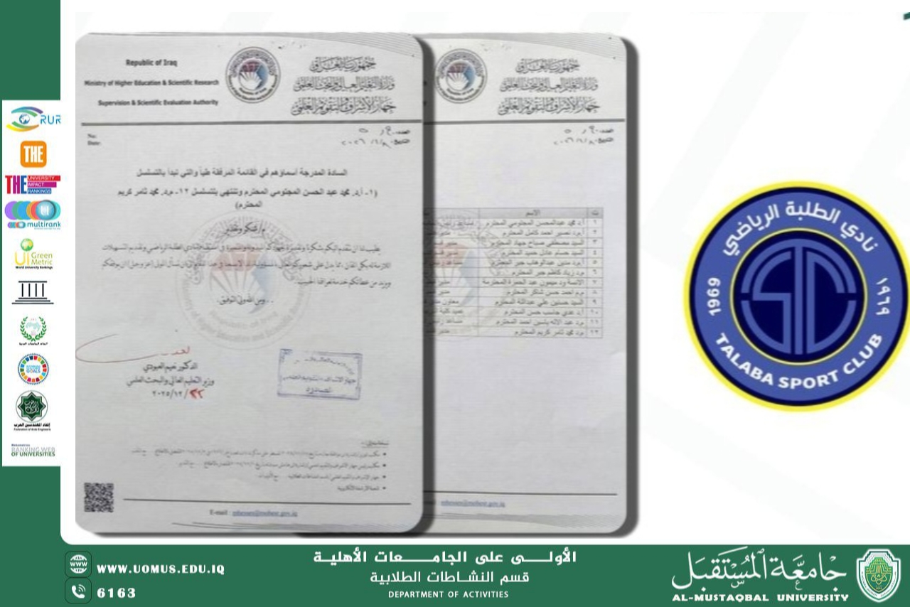 حصلت جامعة المستقبل على كتاب شكر وتقدير من معالي وزير التعليم العالي والبحث العلمي الدكتور نعيم العبودي المحترم، تثمينًا لدور الجامعة ودعمها المتواصل لـ نادي الطلبة، وبما يعكس التزامها بتعزيز الأنشطة الرياضية ودعم المؤسسات الوطنية.