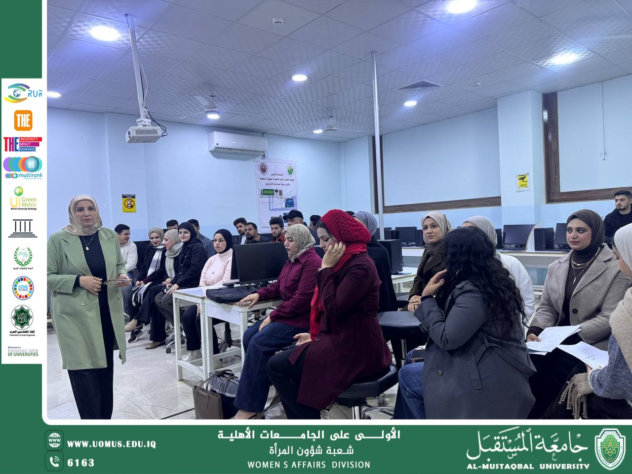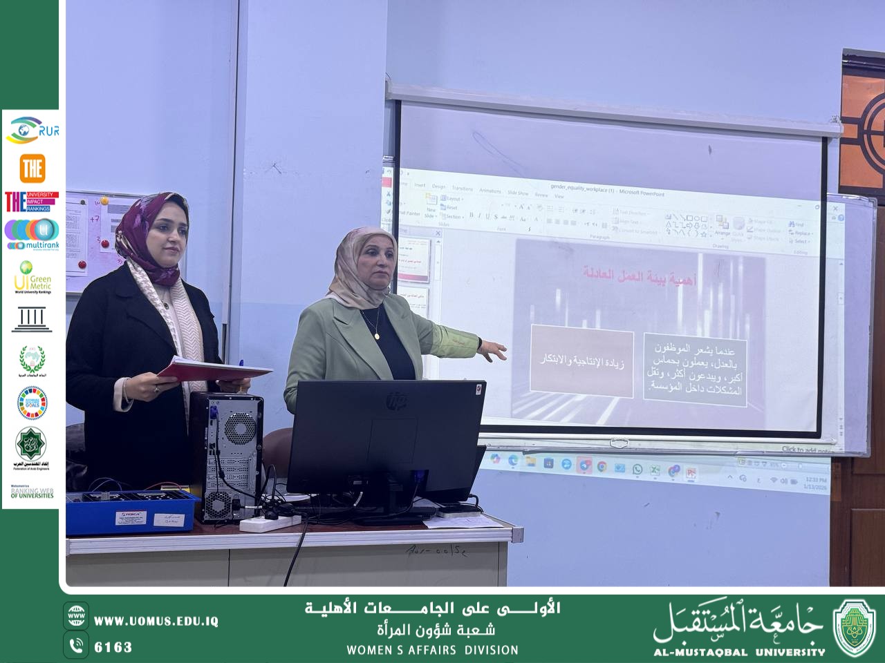 برعاية الاستاذ الدكتور حسن شاكر مجدي رئيس جامعة المستقبل المحترم نظّمت شعبة شؤون المرأة بالتعاون مع وحدة شؤون المرأة في كلية التقنيات الهندسية قسم هندسة تقنيات الحاسوب ندوة توعوية بعنوان ( العدالة بين الجنسين في توفير بيئة عمل صالحة ) بتاريخ 13/1/2026 تنفيذًا للخطة الوطنية الثالثة للمرأة والأمن والسلام / ركيزة المشاركة والاصلاح المؤسسي لعام 2025، وضمن الفقرة الخامسة الخاصة بالحث على توفير بيئة عمل صالحة تحقق معايير العدالة بين الجنسين . وتحقق الهدف الخامس ( العدالة بين الجنسين) من اهداف التنمية المستدامة . قدمت المحاضرة كل من ( م.م. ماري عمران مهدي / مسؤولة شعبة شؤون المرأة و ريا عبد الوهاب هداوي / مسؤولة وحدة شؤون المرأة في قسم هندسة تقنيات الحاسوب) وشهدت الندوة تفاعلًا إيجابيًا من الحضور، مؤكدةً أهمية ترسيخ مبادئ العدالة والمساواة في بيئة العمل الأكاديمية