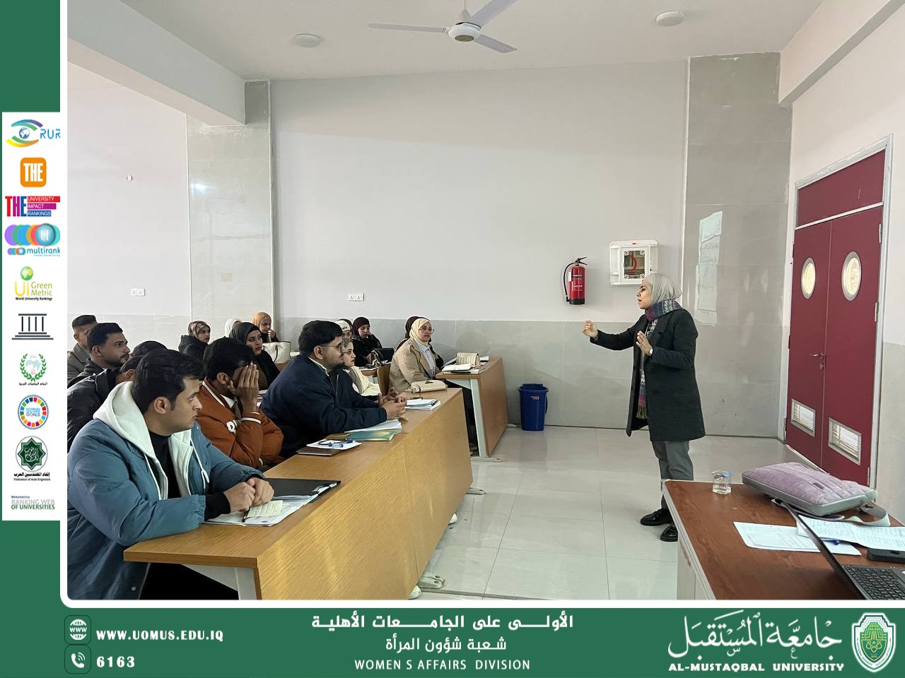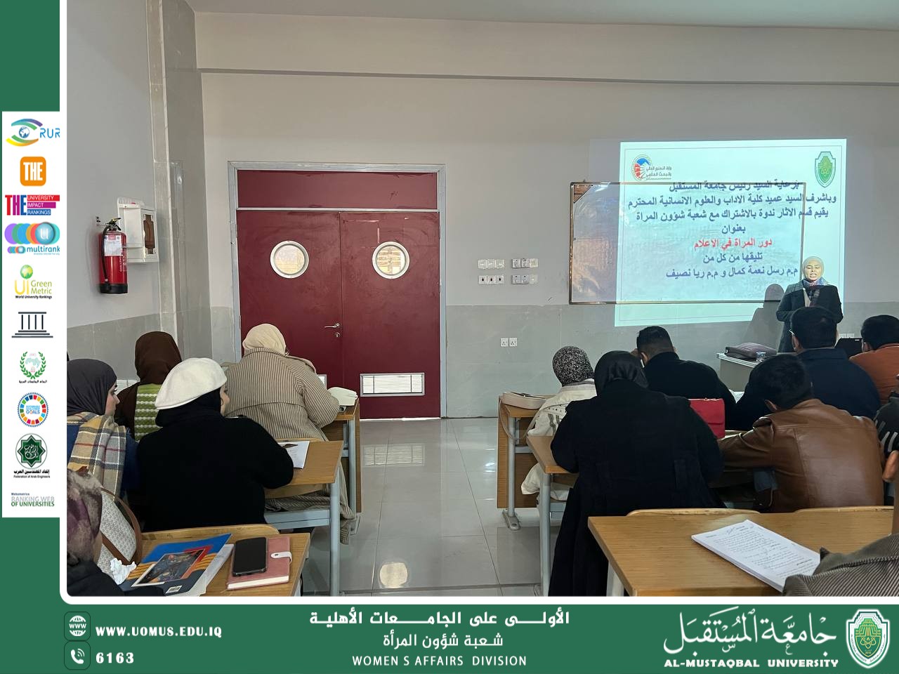 برعاية الاستاذ الدكتور حسن شاكر مجدي المحترم رئيس جامعة المستقبل تقيم شعبة شؤون المرأة وبالتعاون مع وحدة شؤون المرأة / كلية الآداب و العلوم الإنسانية وتقديم م. م. ريا نصيف جاسم. ورشة بعنوان( دور المرأة في الاعلام )يوم الاحد المصادف 18/ كانون الثاني / 2026 .