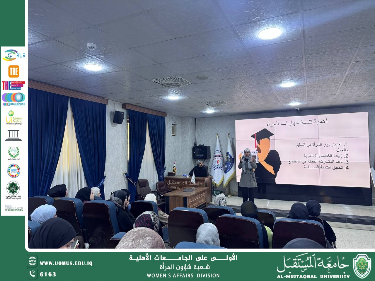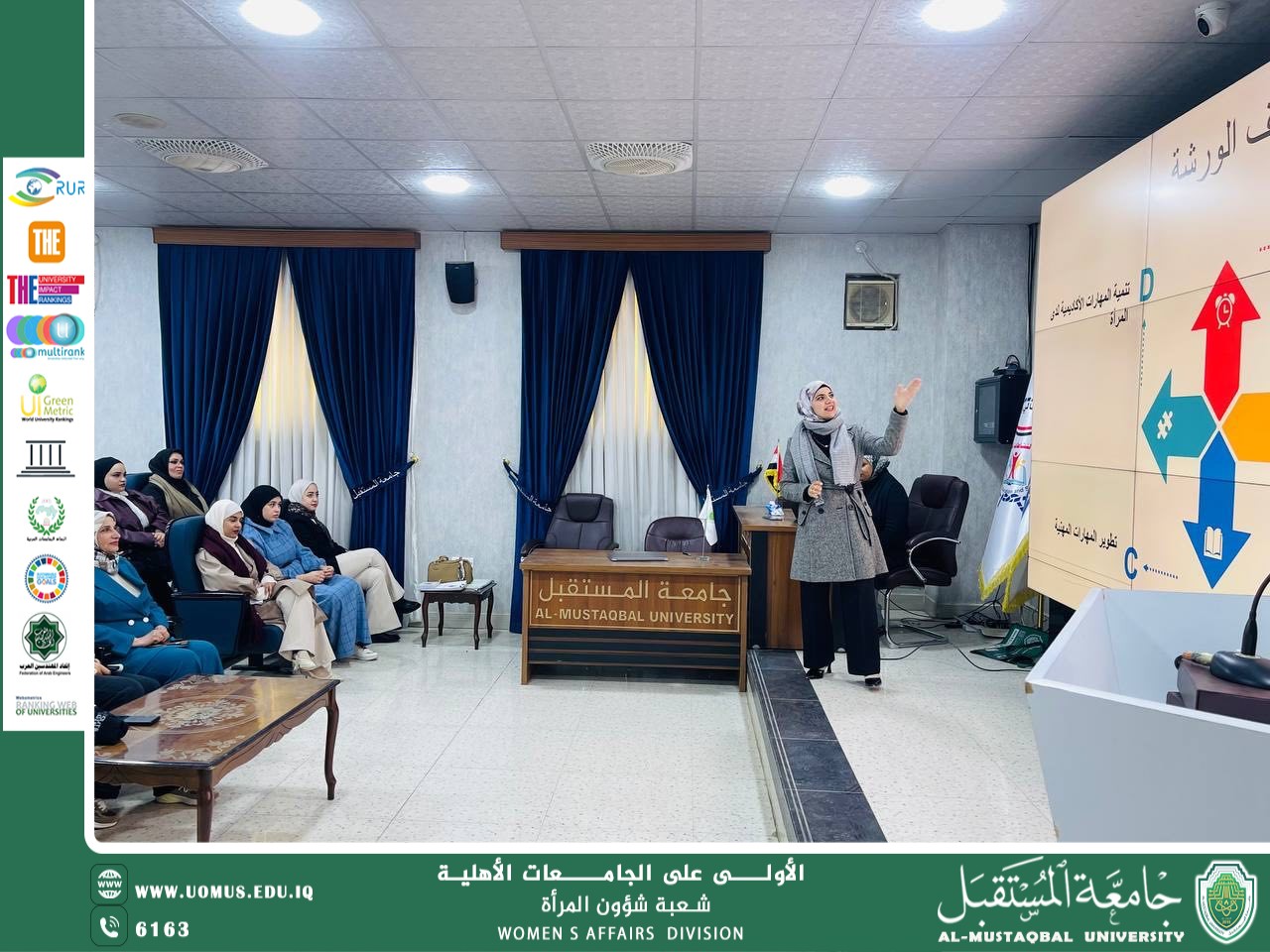 برعاية السيد رئيس جامعة المستقبل الأستاذ الدكتور حسن شاكر مجدي، وبمشاركة السيد عميد كلية العلوم، نظمت شعبة شؤون المرأة في جامعة المستقبل بالتعاون مع قسم الأدلة الجنائية في كلية العلوم ورشة علمية بعنوان «تنمية المهارات الأكاديمية والمهنية للمرأة».