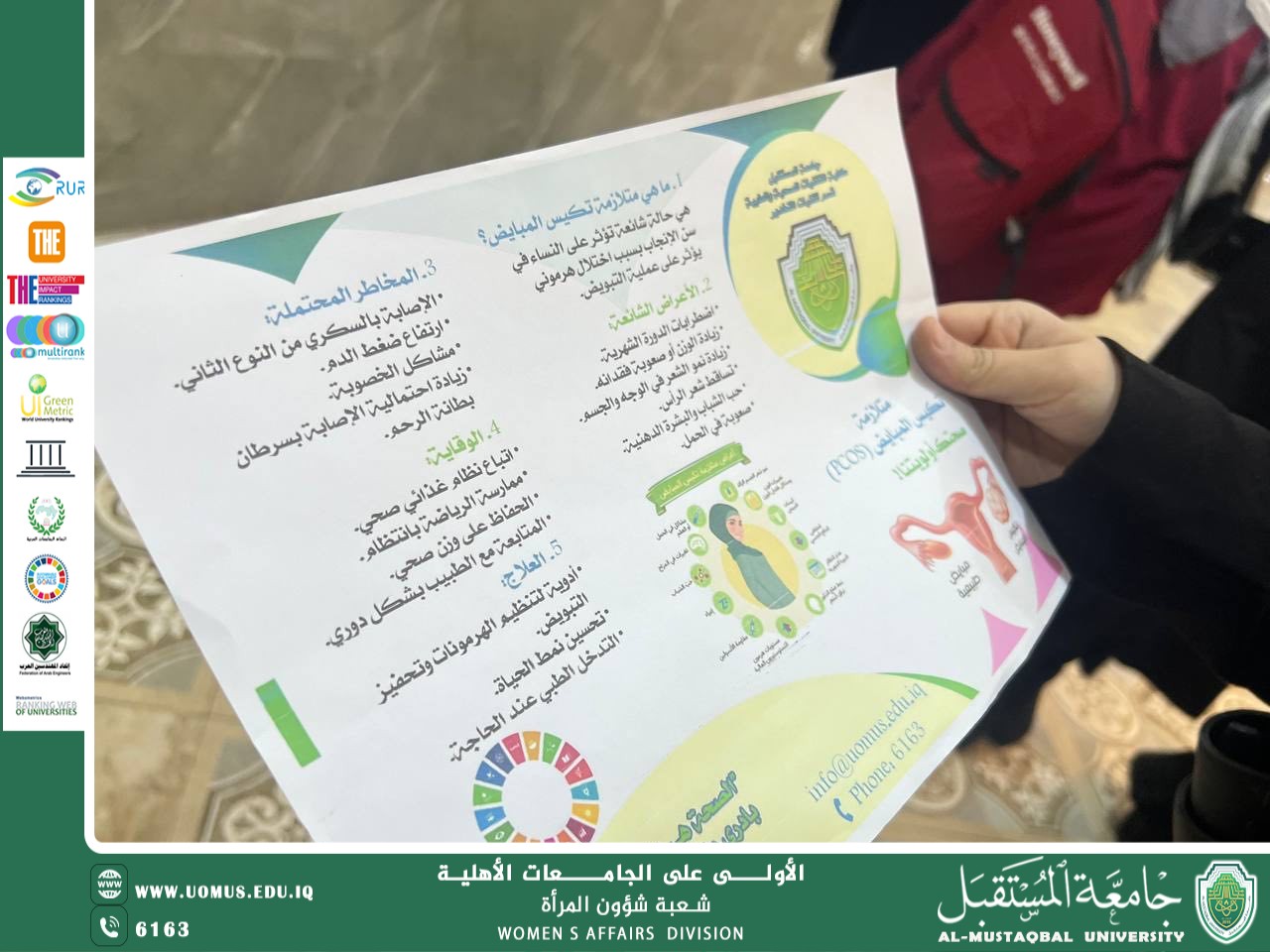برعاية السيد رئيس جامعة المستقبل المحترم نضمت شعبة شؤون المرأة بالتعاون مع كلية التقنيات الصحية والطبية / قسم التخدير حملة بتوزيع بروشورات بعنوان ( مرض تكييس المبايض وتأثيره على الاخصاب) بتاريخ 10/1/2026