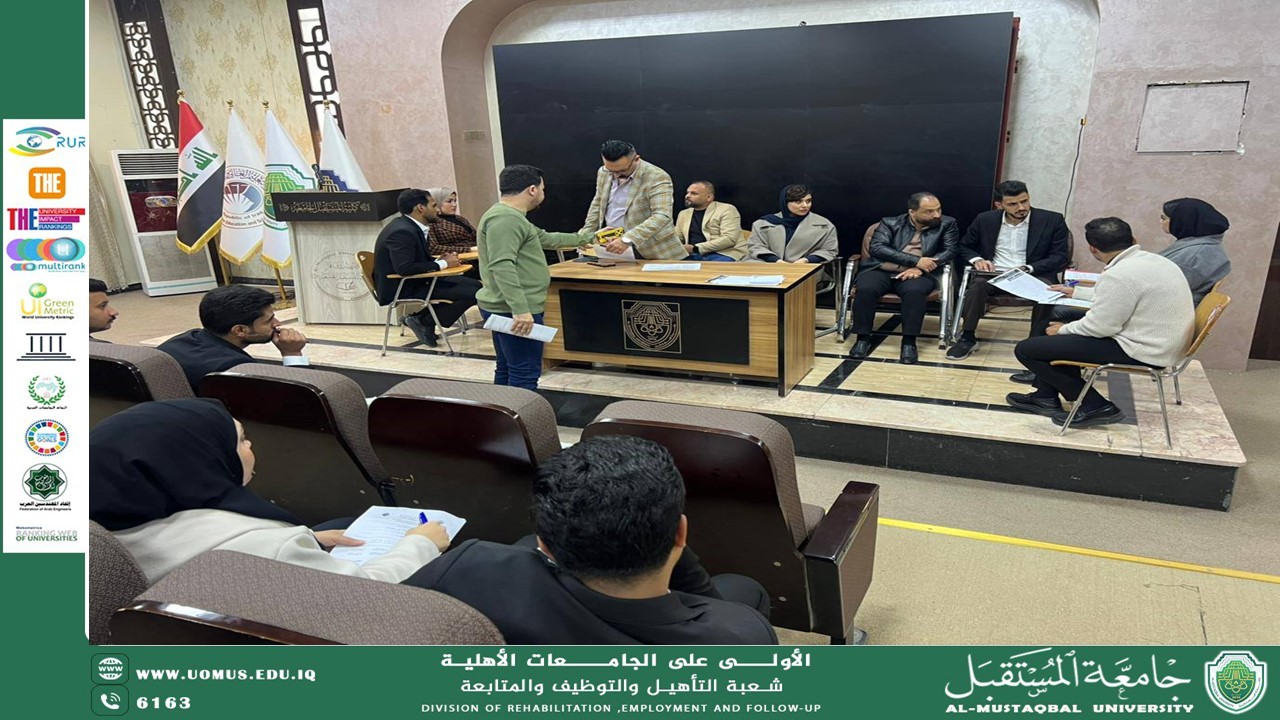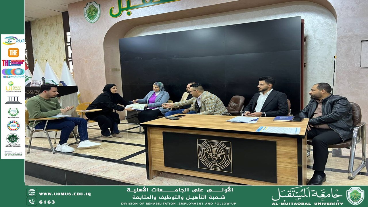 برعاية السيد رئيس جامعة المستقبل الأستاذ الدكتور حسن شاكر مجدي المحترم، وبإشراف السيد مدير الاشراف العلمي والأكاديمي الأستاذ الدكتور مظفر صادق الزهيري المحترم ، نظّمت شعبة التأهيل والتوظيف والمتابعة في جامعة المستقبل مقابلات توظيفية بالتعاون مع شركة الماس وشركة خبراء الطاقة، ضمن جهود الجامعة الهادفة إلى دعم الخريجين وتعزيز فرص اندماجهم في سوق العمل.