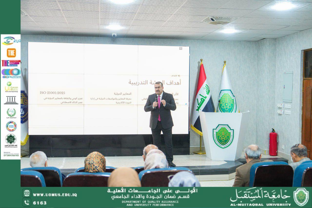 نظّم قسم ضمان الجودة والأداء الجامعي في جامعة المستقبل، وبالتعاون مع وزارة التخطيط / المركز الوطني للتطوير الإداري وتقنية المعلومات، ورشة تدريبية متخصصة بعنوان «إدارة الجودة الأكاديمية وفق المواصفات والمعايير الدولية – رحلة نحو الاعتماد الدولي»، بمشاركة مسؤولي ضمان الجودة في كليات وأقسام الجامعة.
