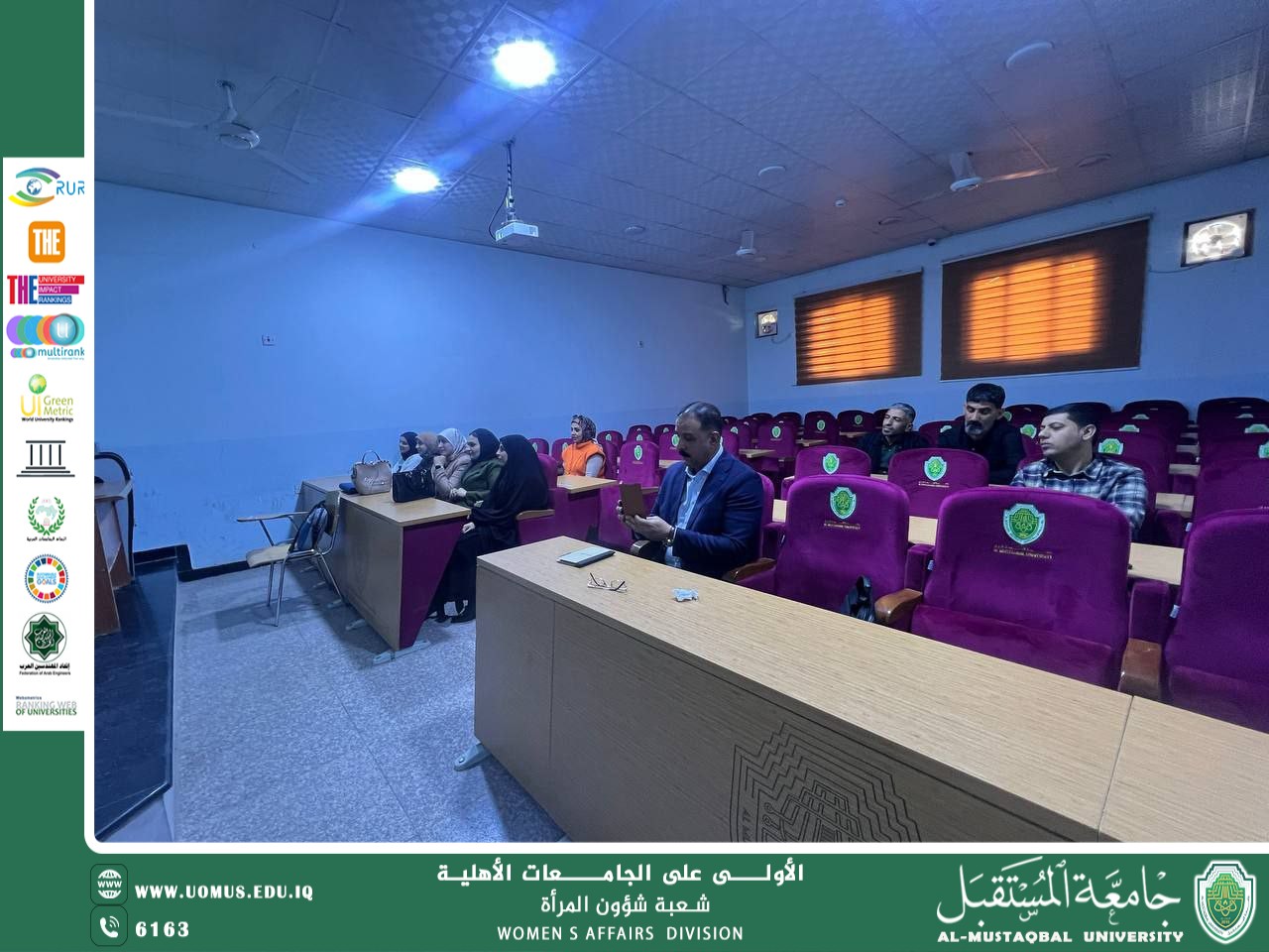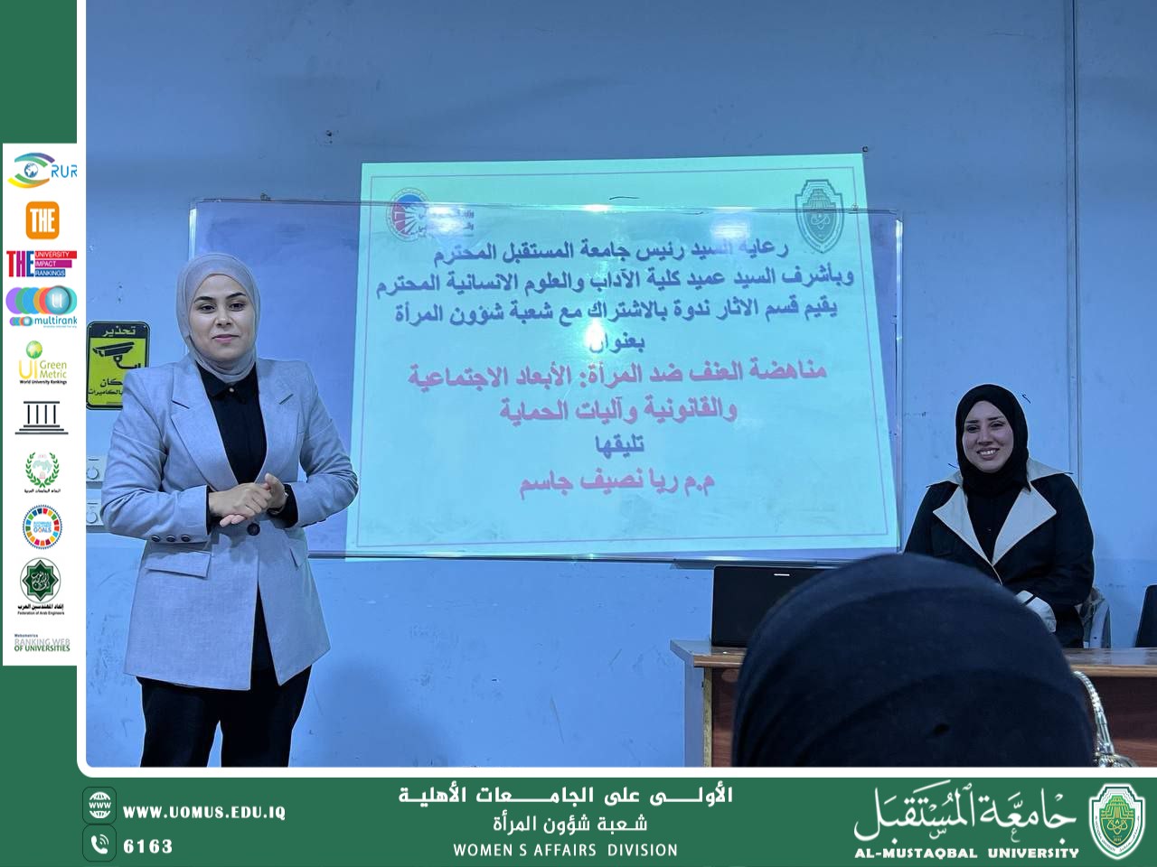 برعاية الاستاذ الدكتور حسن شاكر مجدي المحترم رئيس جامعة المستقبل تقيم شعبة شؤون المرأة وبالتعاون مع وحدة شؤون المرأة / كلية الآداب و العلوم الإنسانية وتقديم م. م. ريا نصيف جاسم . ندوة بعنوان( مناهضة العنف ضد المرأة: الأبعاد الاجتماعية والقانونية وآليات الحماية )يوم الثلاثاء المصادف 10/ شباط / 2026 .