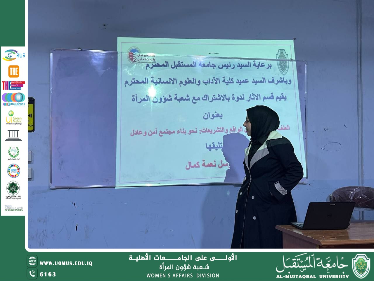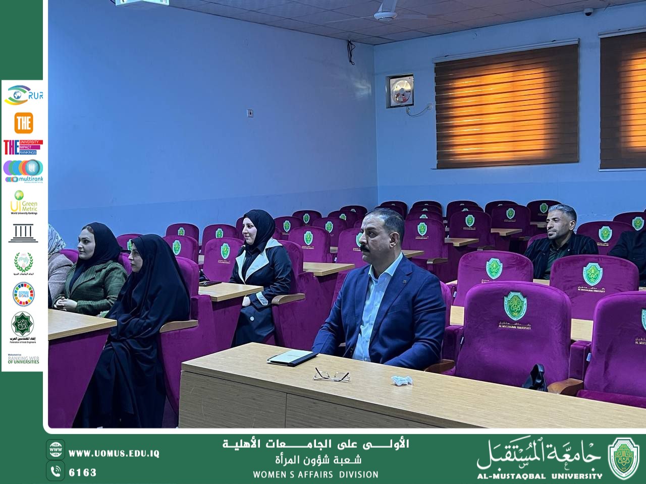 برعاية الاستاذ الدكتور حسن شاكر مجدي المحترم رئيس جامعة المستقبل تقيم شعبة شؤون المرأة وبالتعاون مع وحدة شؤون المرأة / كلية الآداب و العلوم الإنسانية وتقديم مسؤولة وحدة شؤون المرأة في الكلية م. م. رسل نعمة كمال . ندوة بعنوان( العنف ضد المرأة بين الواقع والتشريعات: نحو بناء مجتمع آمن وعادل )يوم الثلاثاء المصادف 11/ شباط / 2026 .