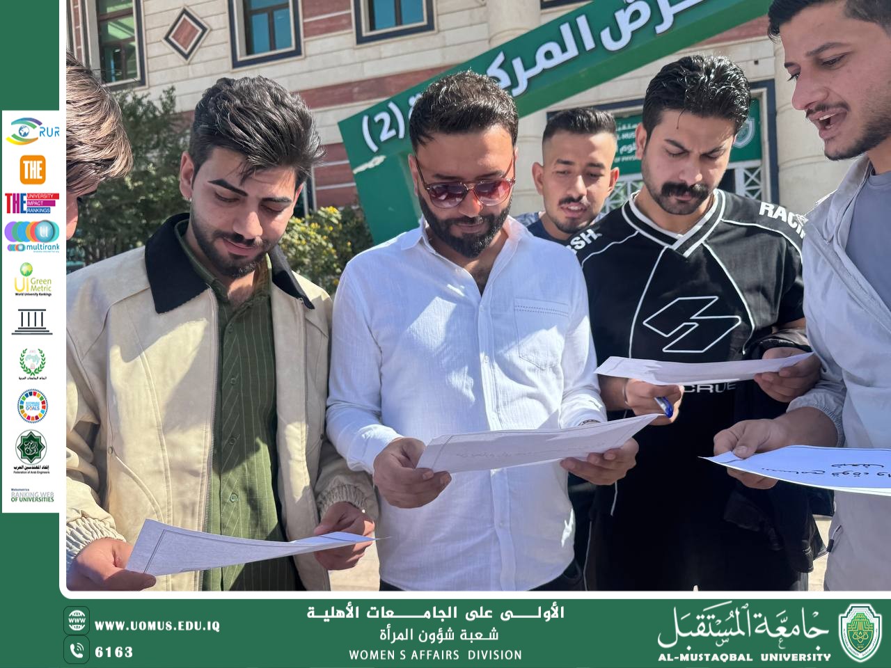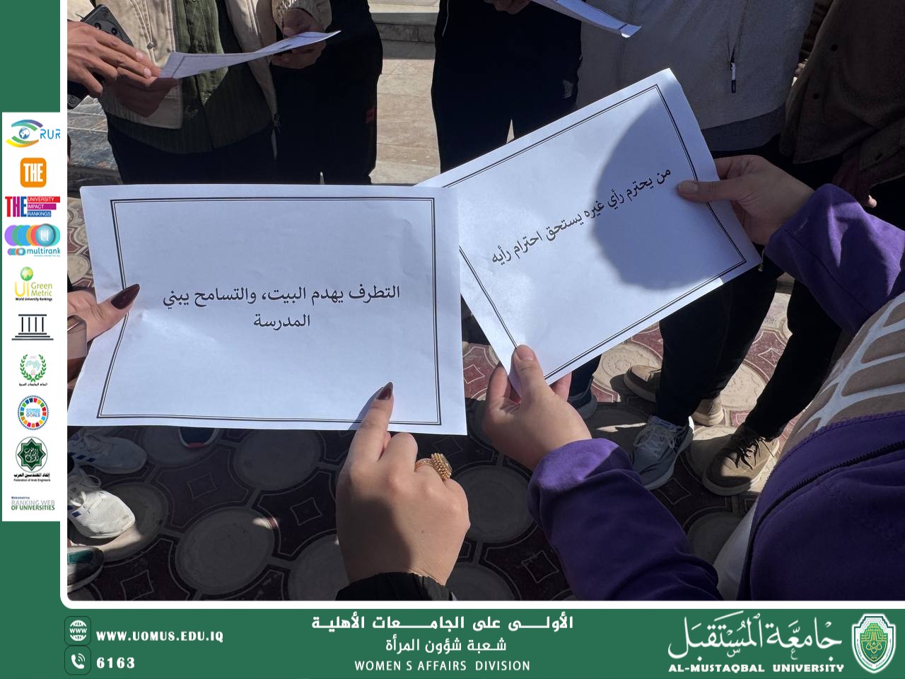 برعاية السيد رئيس جامعة المستقبل المحترم، نظّمت شعبة شؤون المرأة بالتعاون مع كلية التربية البدنية وعلوم الرياضة حملة توعوية بعنوان: (التطرّف يهدم البيت… والتسامح يبني المدرسة)،بتاريخ 16/2/2026 قام بها كل من الأستاذة ضي سالم، والأستاذة آية أنس،وذلك ضمن أنشطتها الهادفة إلى نشر ثقافة التسامح ونبذ التطرف، وتنفيذاً لمحاور الخطة الاستراتيجية الوطنية لمناهضة العنف تجاة النساء والفتيات ..