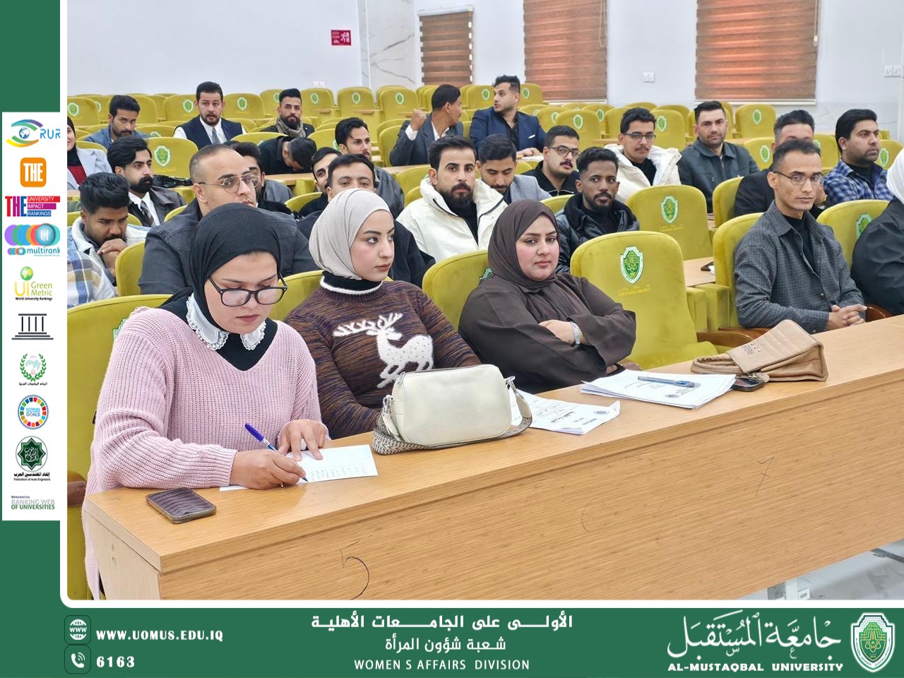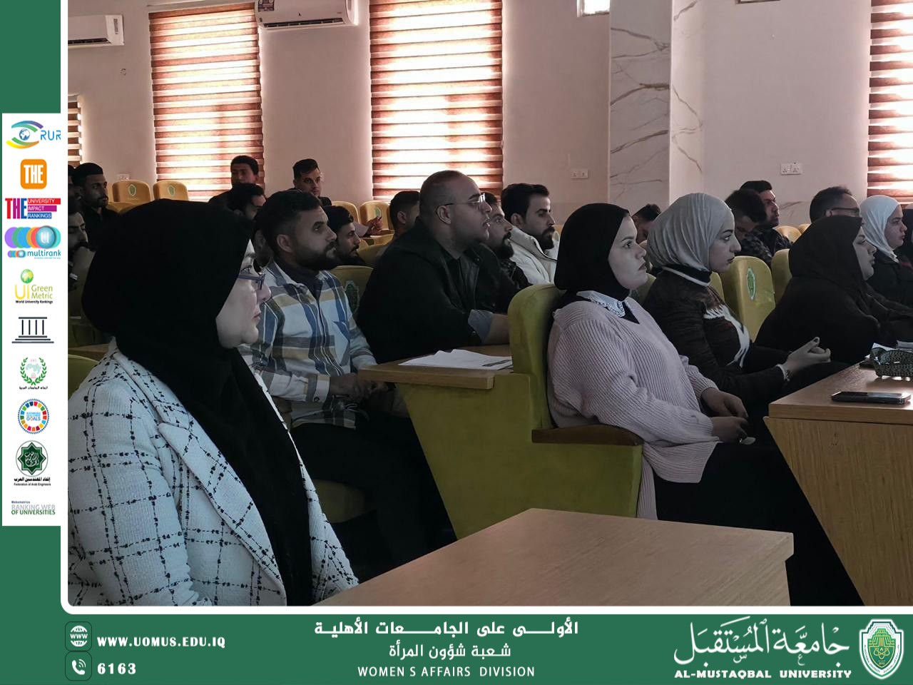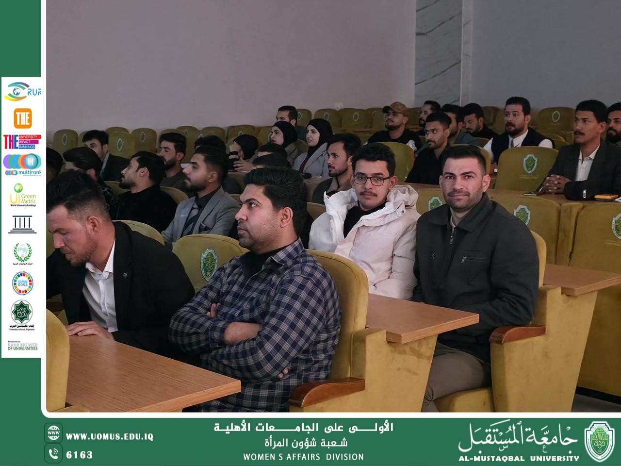 برعاية رئيس جامعة المستقبل المحترم نظّمت شعبة شؤون المرأة في الجامعة، وبالتعاون مع كلية العلوم، ورشة توعوية بعنوان (التطرف العنيف… أسبابه وسبل معالجته)، وذلك ضمن إطار الجهود الرامية إلى تعزيز الأمن الفكري وترسيخ ثقافة الاعتدال داخل الوسط الجامعي.بتاريخ ١١/ ٢ /٢٠٢٦.