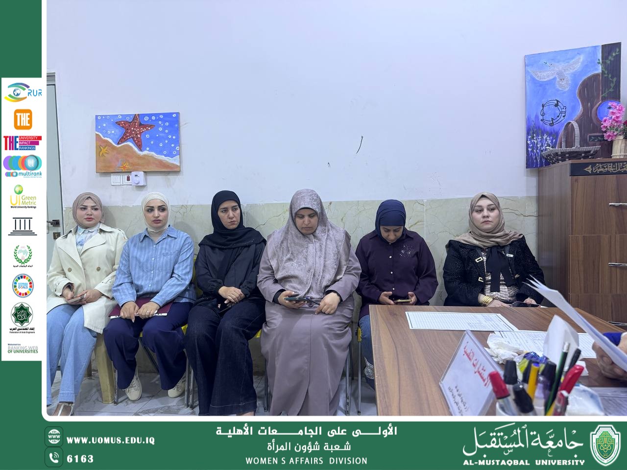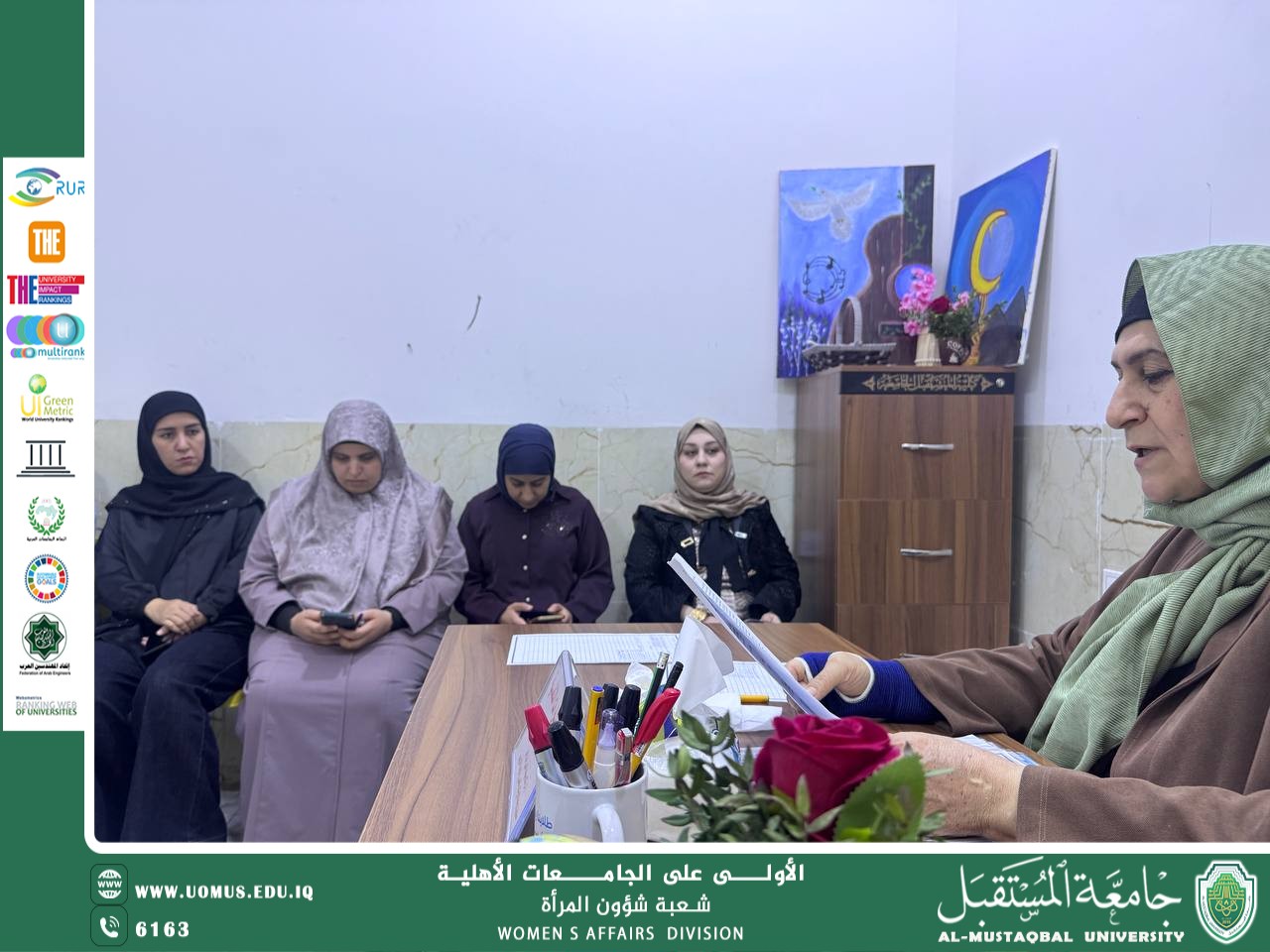 برعاية السيد رئيس جامعة المستقبل المحترم، قامت شعبة شؤون المرأة، بالتعاون مع وحدة شؤون المرأة في كلية التربية، بتنظيم ورشة توعوية قدّمتها أ.د. ثناء بهاء الدين عبد الله بعنوان: