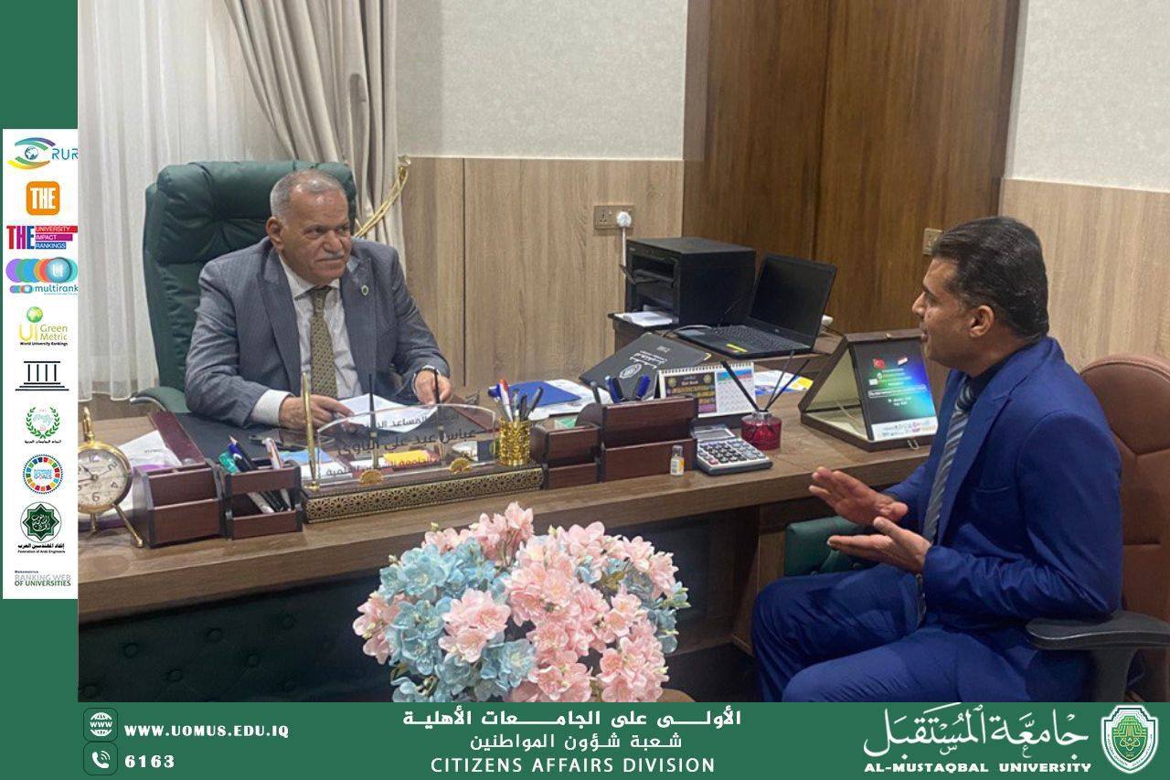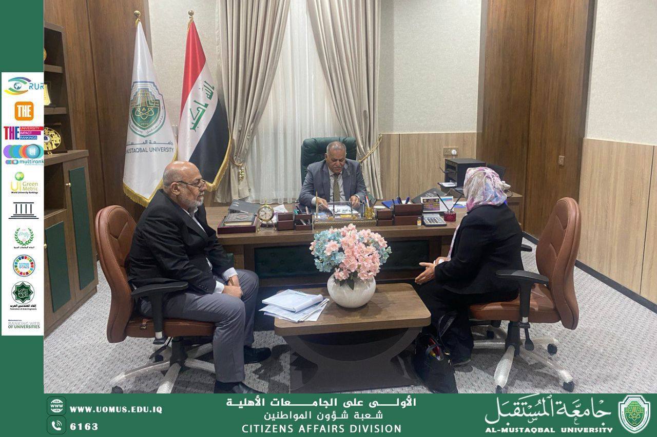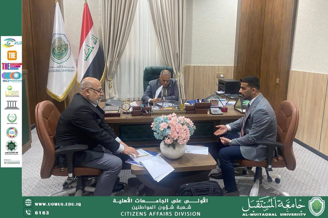 ضمن نشاطاته الدورية، يواصل السيد رئيس جامعة المستقبل الأستاذ الدكتور حسن شاكر مجدي المحترم إجراء المقابلات مع المواطنين من (التدريسيين والموظفين والطلبة وذويهم)، حيث يتم الاستماع إلى القضايا والمقترحات والآراء التي يطرحونها، والعمل على إيجاد الحلول المناسبة للمشكلات المطروحة، فضلاً عن دعم المبادرات التي تسهم في تطوير البيئة العلمية والأكاديمية في الجامعة، وقد جرت هذه المقابلات في يوم الأربعاء الموافق 2026/3/4 في مبنى رئاسة الجامعة