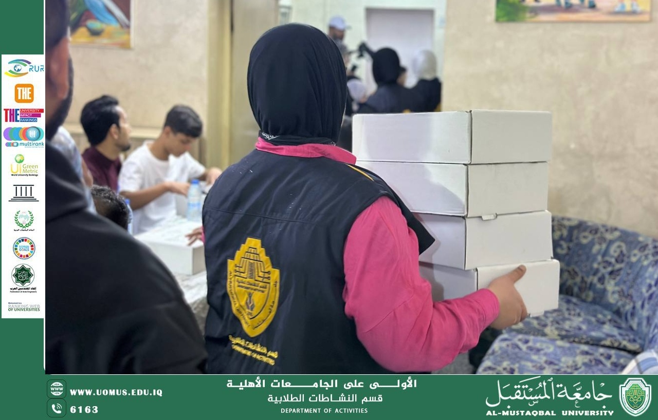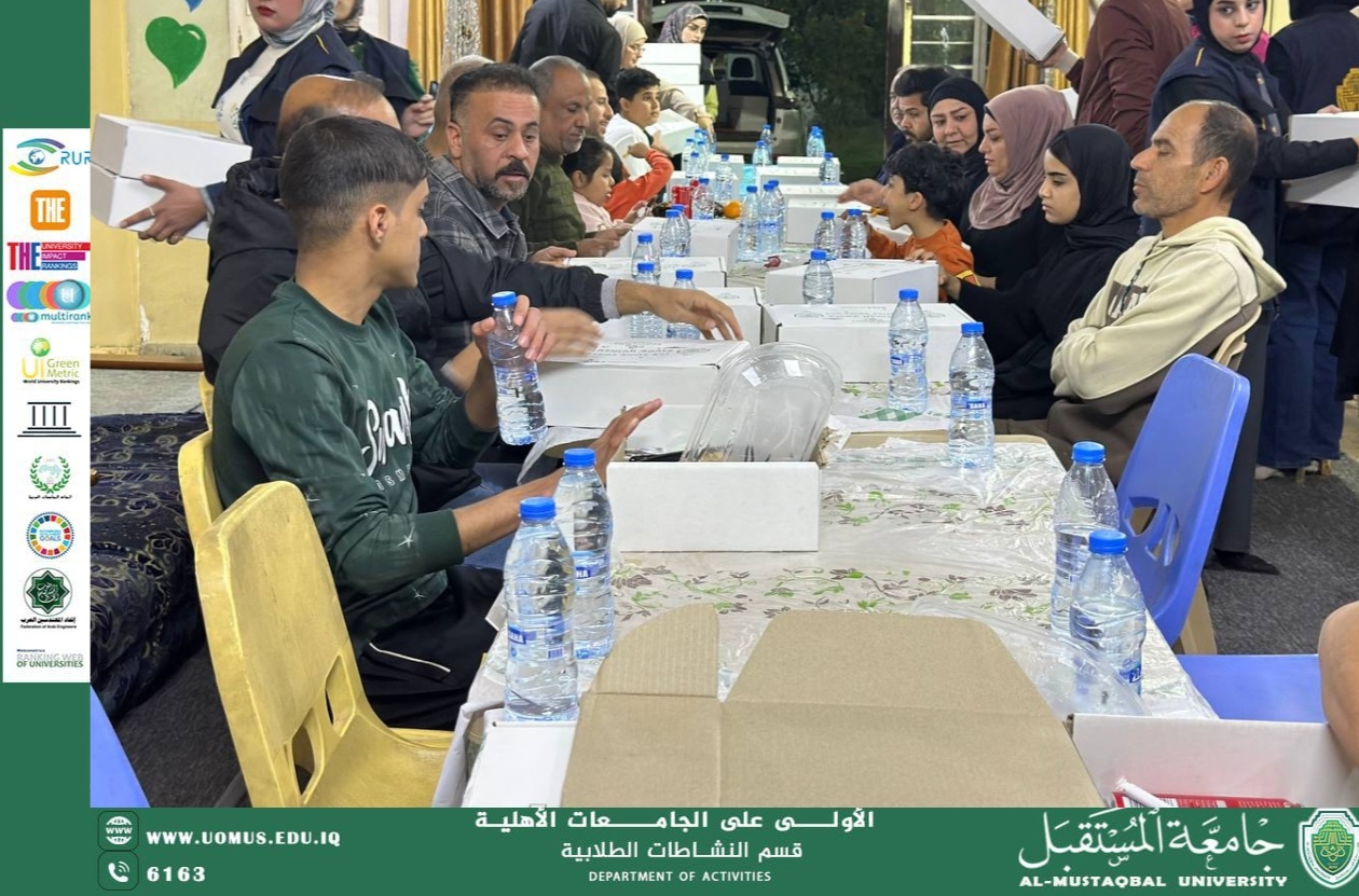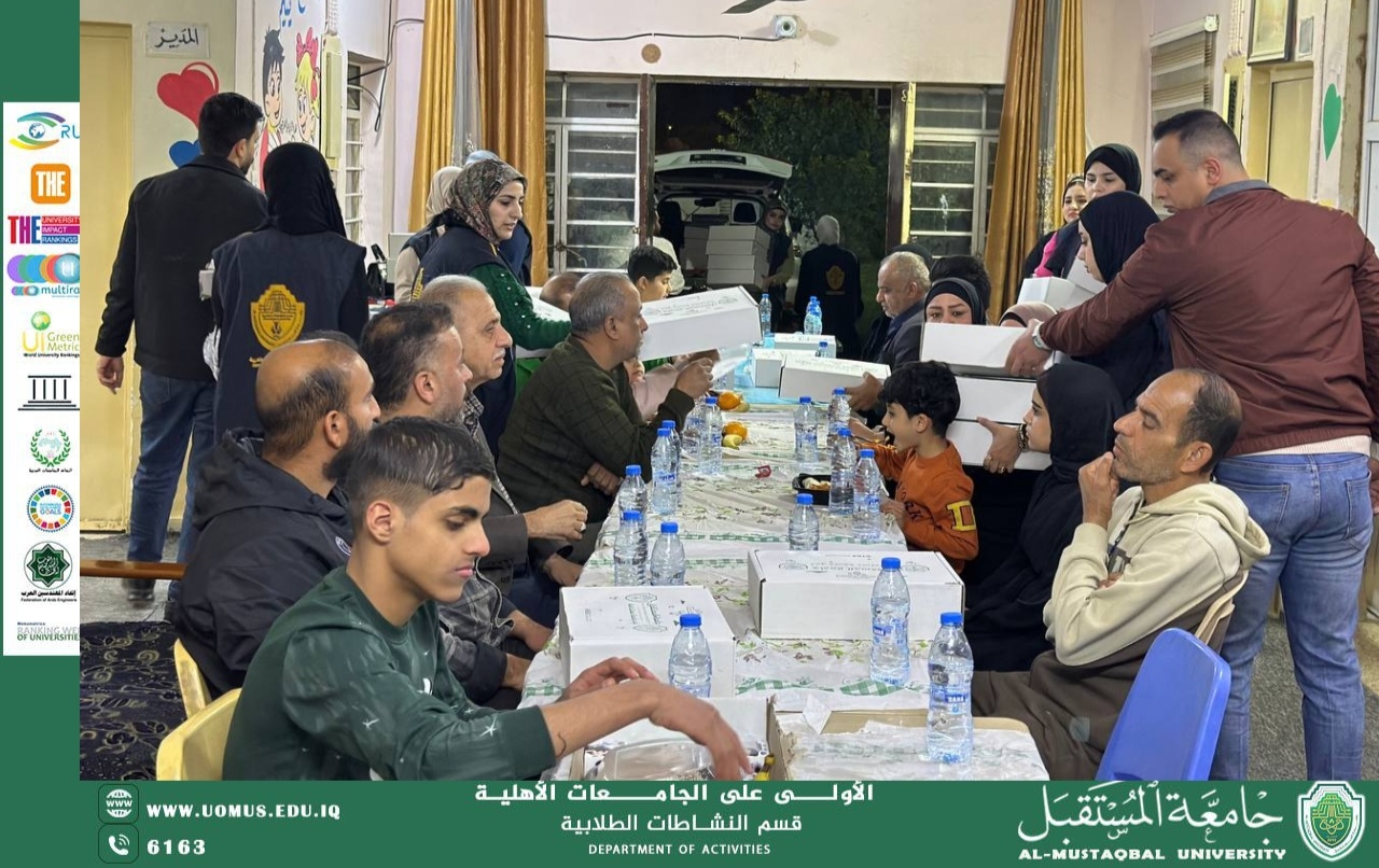نظّم قسم النشاطات الطلابية في جامعة المستقبل إفطارًا جماعيًا للأيتام وذوي الاحتياجات الخاصة، في دار رعايه الدوله الايتام بتاريخ 11/3/2026 المصادف يوم الاربعاء تزامنًا مع ذكرى استشهاد الإمام علي بن أبي طالب (عليه السلام)، في مبادرة إنسانية تهدف إلى تعزيز قيم التكافل والتراحم وإدخال الفرحة إلى قلوب هذه الفئات حيث شارك عدد من طلبة الجامعة في تنظيم الفعالية وتقديم وجبات الإفطار وسط أجواء تسودها روح التعاون والعمل التطوعي وتأتي هذه المبادرة ضمن الأنشطة المجتمعية التي تنفذها جامعة المستقبل، في إطار حرصها على دعم العمل الإنساني وتعزيز روح المسؤولية الاجتماعية لدى الطلبة.