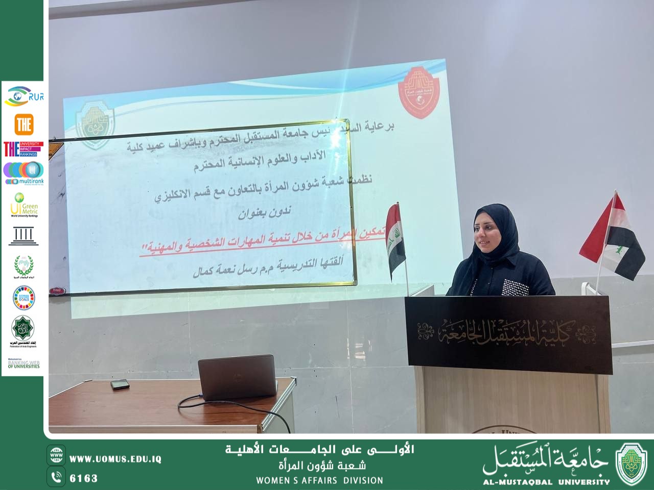 برعاية الأستاذ الدكتور حسن شاكر مجدي، رئيس جامعة المستقبل المحترم، نظّمت شعبة شؤون المرأة، وبالتعاون مع وحدة شؤون المرأة في كلية الآداب والعلوم الإنسانية / قسم اللغة الإنكليزية وآدابها، ندوة علمية بعنوان: