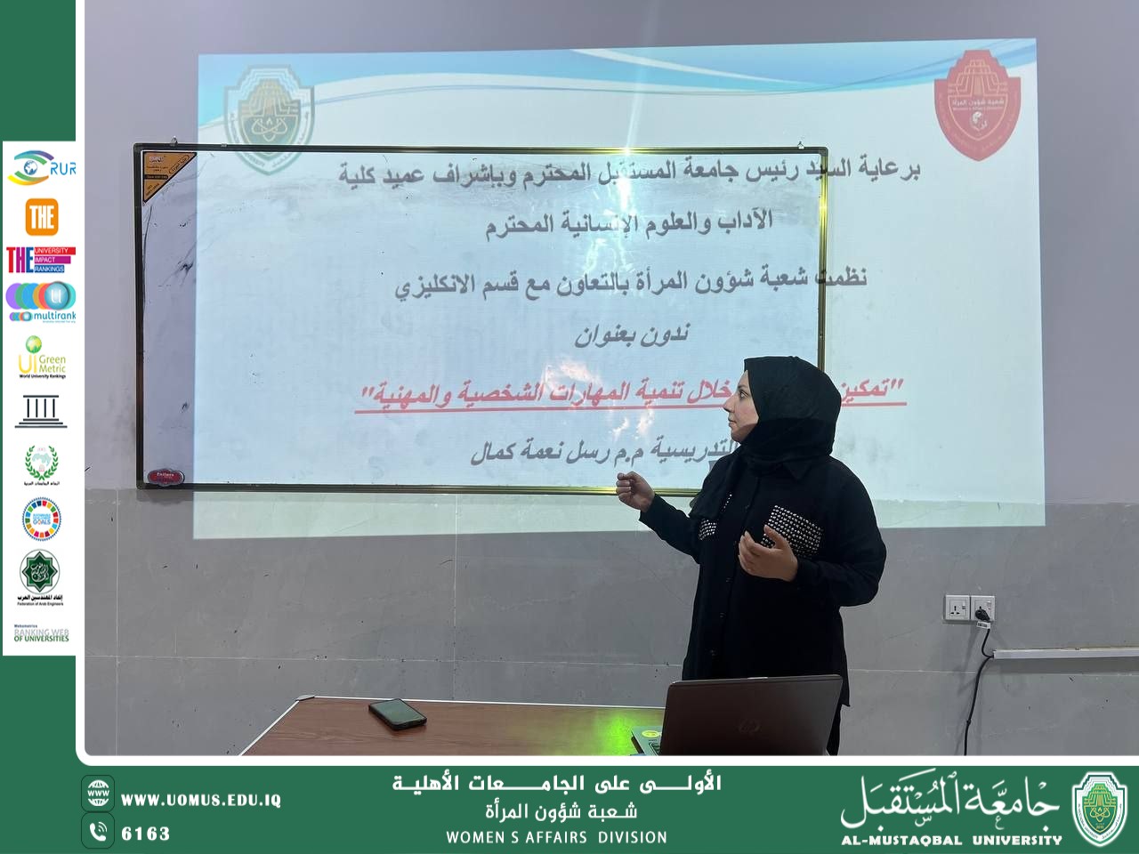 (تمكين المرأة من خلال تنمية المهارات الشخصية والمهنية)، وذلك يوم الثلاثاء الموافق 31/3/2026، قدّمتها م.م رسل نعمة كمال.