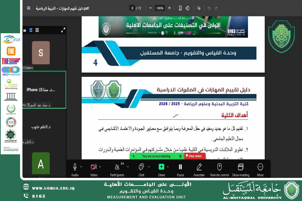 وتهدف الورشة إلى توحيد آلية إعداد دليل المهارات في المقررات الدراسية، بما يسهم في تطوير منظومة القياس والتقويم وتعزيز جودة العملية التعليمية في جامعة المستقبل، انسجامًا مع توجهات الجامعة نحو تحقيق التميز الأكاديمي وضمان الجودة الشاملة في الأداء التعليمي.