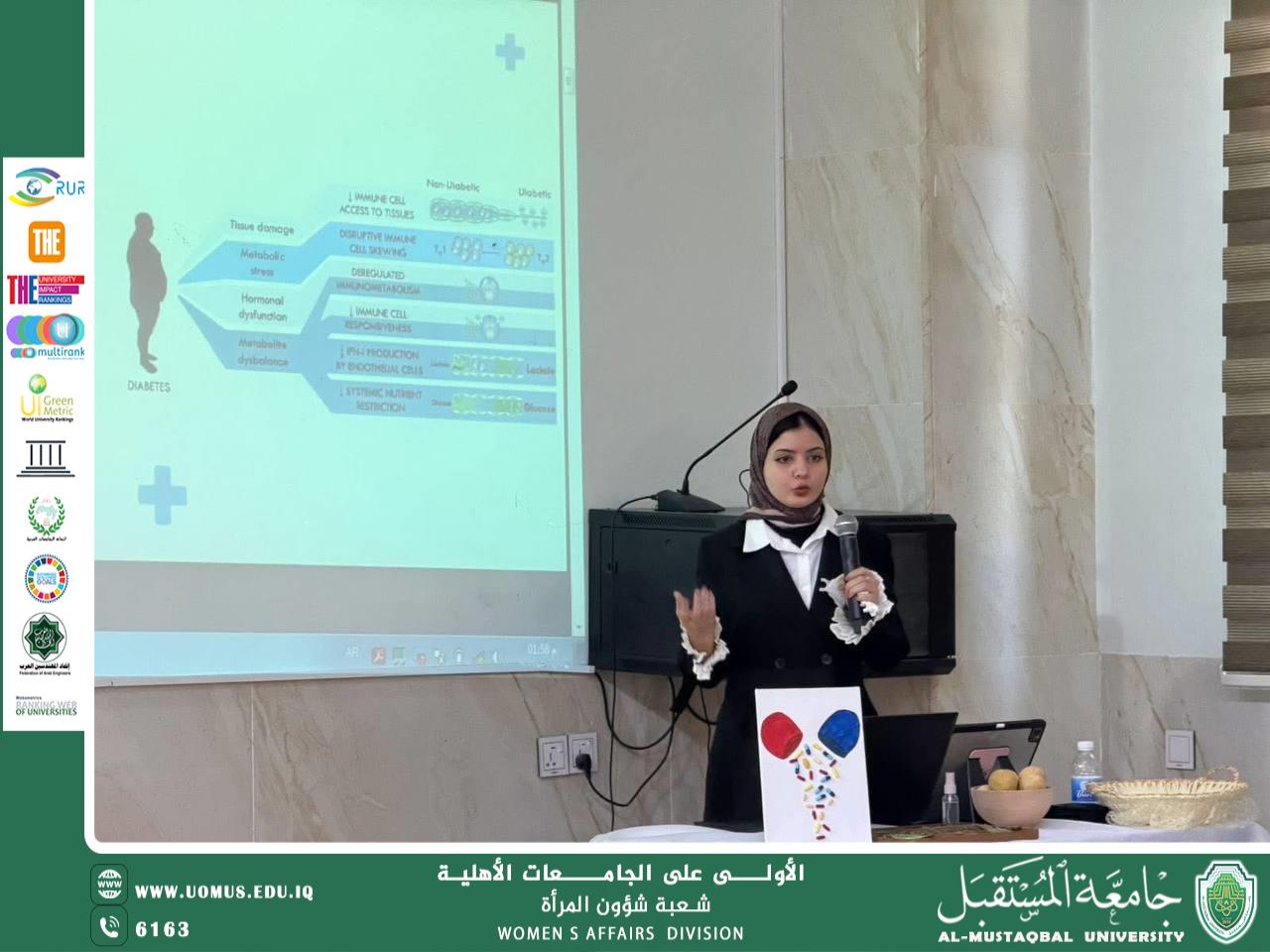 نظمت شعبة شؤون المراة في جامعة المستقبل نشاطاً توعوياً مميزا بمناسبة اليوم العالمي لمرضى السكري بحضور مساعد رئيس الجامعة للشؤون العلمية الأستاذ الدكتور عباس الباوي المحترم، وعميد كلية الصيدلة الأستاذ المساعد الدكتور أحمد خالد الظالمي المحترم، وعدد من أعضاء الهيئة التدريسية، قدّمها عدد من طلبة الكلية، تناولت أسباب المرض وأنواعه وطرق الوقاية منه وأهمية التشخيص المبكر والعلاج الدوائي الصحيح، إضافةً إلى دور الصيدلي في متابعة المرضى وإرشادهم نحو نمط حياة صحي.