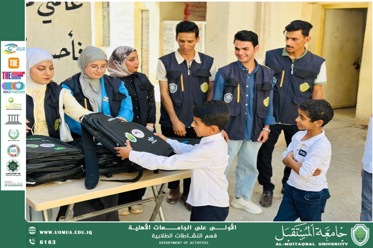 قام قسم النشاطات الطلابية في جامعة المستقبل بحملة واسعة شملت توزيع القرطاسية والحقائب المدرسية على عدد من مدارس محافظة بابل، وذلك ضمن حملة الأعمال التطوعية المستمرة التي تنفذها الجامعة على مدار العام، دعمًا للمسيرة التربوية وتشجيعًا للطلبة على مواصلة التعليم.