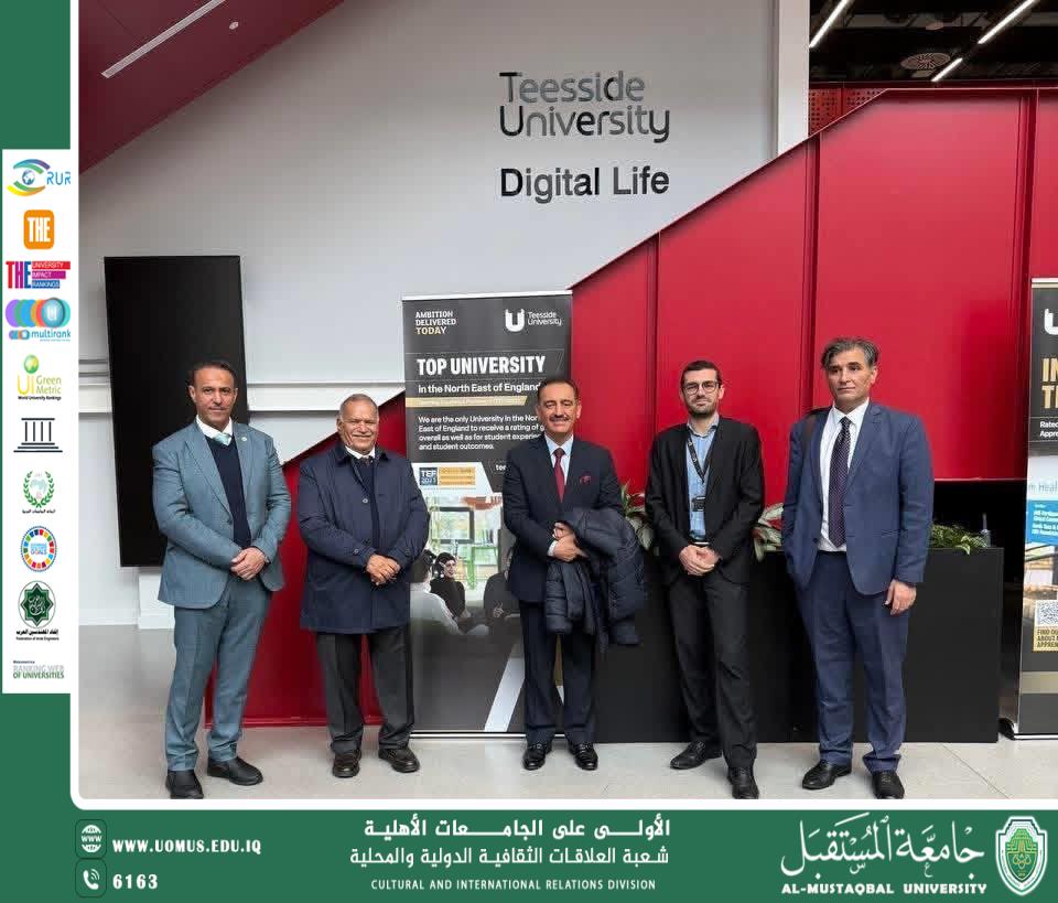 في إطار سعيها المستمر لتعزيز حضورها العلمي والبحثي على المستوى العالمي، اجرى الأستاذ الدكتور حسن شاكر مجدي، رئيس جامعة المستقبل، برفقة السيد عميد كلية التقنيات الهندسية، الأستاذ المساعد الدكتور أزهر محسن عبد، زيارة رسمية إلى بريطانيا قام خلالها الوفد بزيارة جامعة تيسايد (Teesside University)، بحضور المستشار الثقافي الأستاذ الدكتور قصي الأحمدي، وجرت محادثات موسعة مع رئيس جامعة تيسايد، ومدير العلاقات الدولية، وعميد كلية الحاسوب والهندسة، وعدد من الأساتذة المتخصصين في مجالات الذكاء الاصطناعي والطاقة المتجددة. وفي بداية اللقاء، قدم الأستاذ المساعد الدكتور أزهر محسن عبد عرضًا استعرض فيه تصنيف جامعة المستقبل، ومراتبها الأولى في العراق، وحصولها على شهادات التميز والتطوير البحثي، بالإضافة إلى مجالات البحوث المقترحة التي يمكن تنفيذها بشكل مشترك مع جامعة تيسايد، مع التشديد على مفاهيم الابتكار والتطوير. اشاد الحضور بالعرض المقدم، مؤكدين أن جامعة تيسايد تُعد من الجامعات الرائدة في التطبيقات الصناعية، وتحتل المركز الأول في شمال شرق إنجلترا ، و في اللقاء تم توقيع اتفاقية تعاون مشترك بين الجامعتين تتضمن: