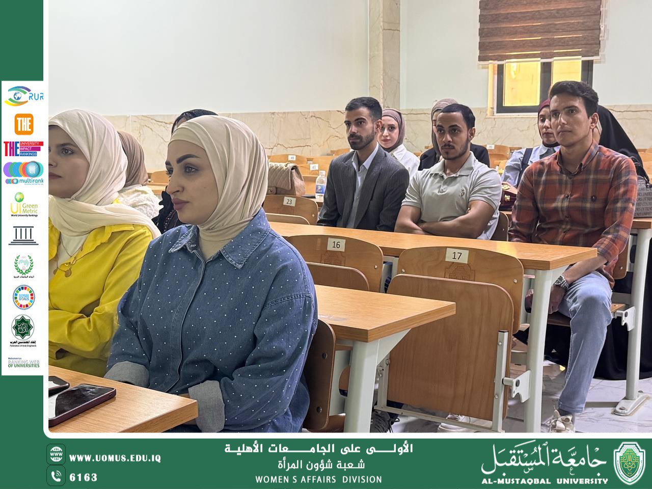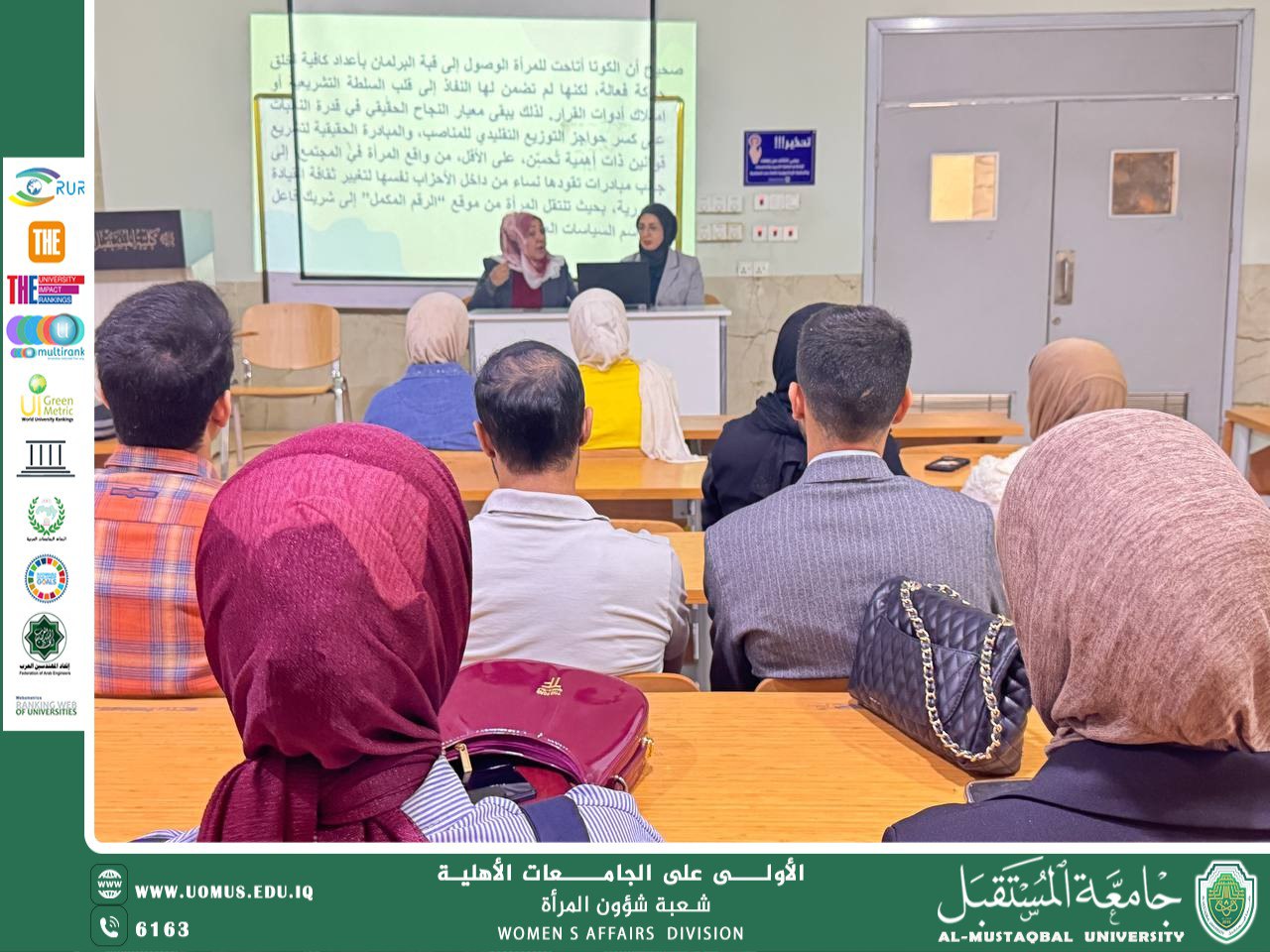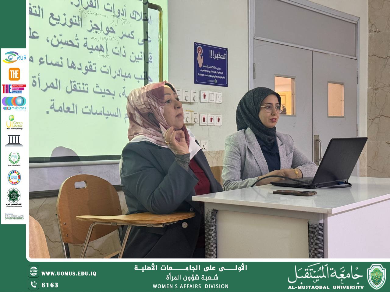 وبإشراف أ. د. ساهره قحطان، مسؤولة الشعبة ، وتنفيذ من قبل م. م. سرور حافظ محمد بتاريخ 8/11/2025 وبحضور كل من طالبات جامعة المستقبل وموظفيها وقد تناولت الورشة شؤون المرأة أهمية دور المرأة في المجتمع ومشاركتها الفاعلة في التنمية المستدامة. توضح الورشة أن تمكين المرأة في المجالات الاقتصادية والاجتماعية والسياسية يعدّ أساسًا لتقدم المجتمعات، إذ تسهم المرأة في بناء الأسرة وتنمية الاقتصاد وصنع القرار. كما تؤكد الورشة على ضرورة دعم إدارات شؤون المرأة في المؤسسات الحكومية والأهلية لتفعيل البرامج التي تعزز المساواة والعدالة بين الجنسين.
