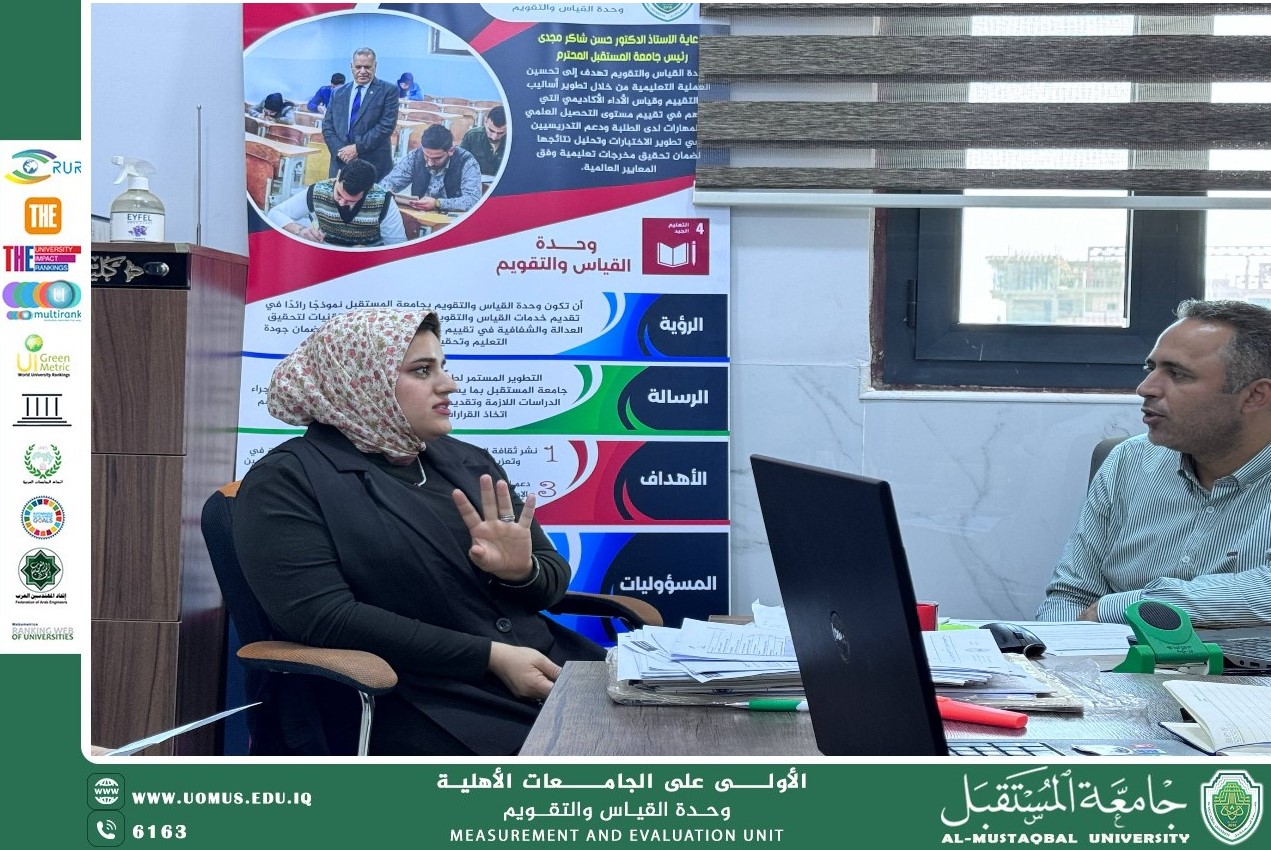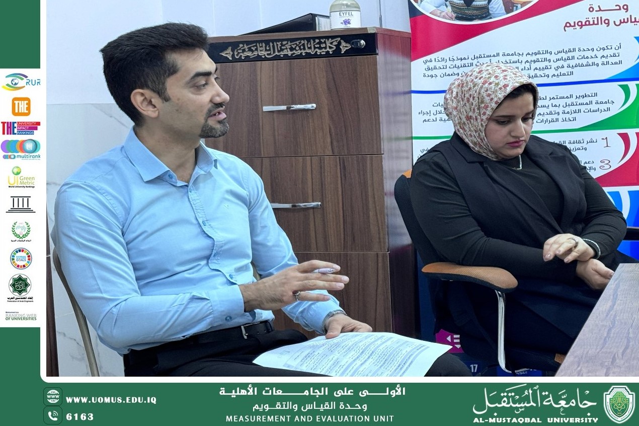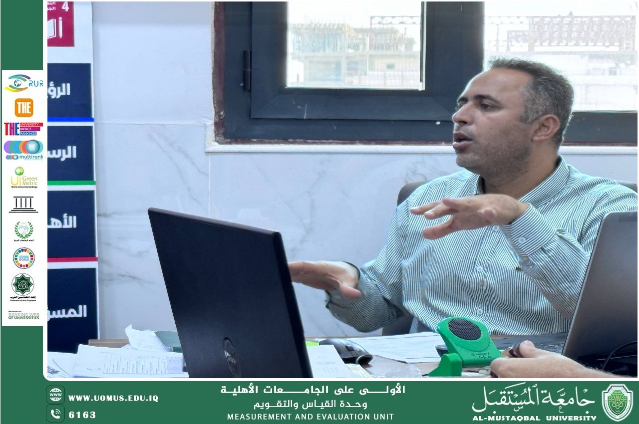 برعاية السيد رئيس جامعة المستقبل، الأستاذ الدكتور حسن شاكر مجدي المحترم، وبإشراف الأستاذ المساعد الدكتور عباس عبد علي الباوي المحترم، وبتوجيه ومتابعة الأستاذ الدكتور سعد فتح الله العالم مدير وحدة القياس والتقويم في الجامعة، تم مناقشة خطة البرامج التدريبية في لاقياس والتقويم لهذا العام