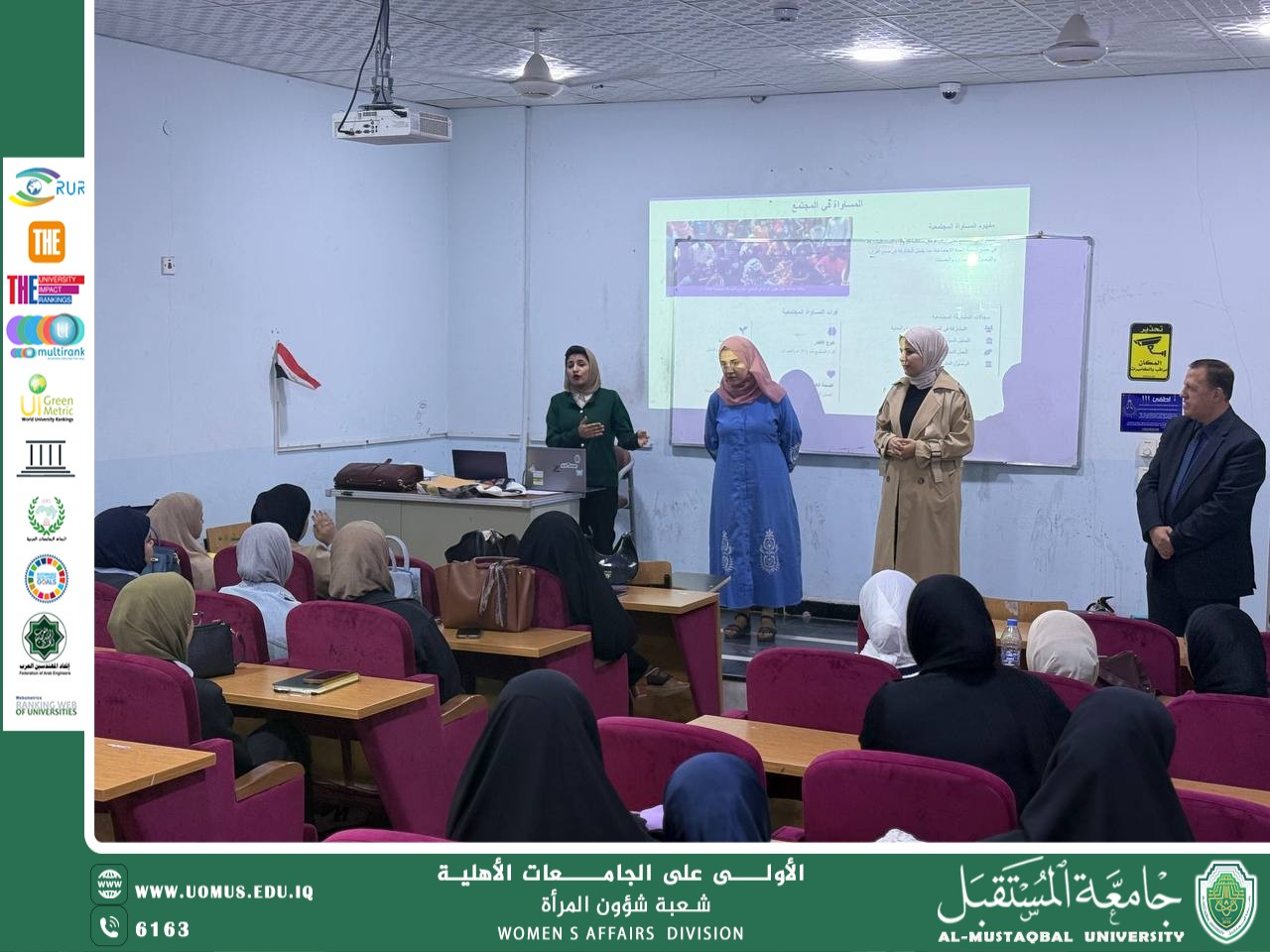 واختُتمت الورشة بفتح باب الحوار أمام الطلبة لعرض آرائهم ومقترحاتهم بشأن تعزيز دور المرأة في المؤسسات الأكاديمية والمهنية، مع التأكيد على أهمية نشر الوعي الحقوقي وترسيخ ثقافة المساواة داخل المجتمع الجامعي، بما ينسجم مع التوجهات الوطنية لشؤون المرأة.